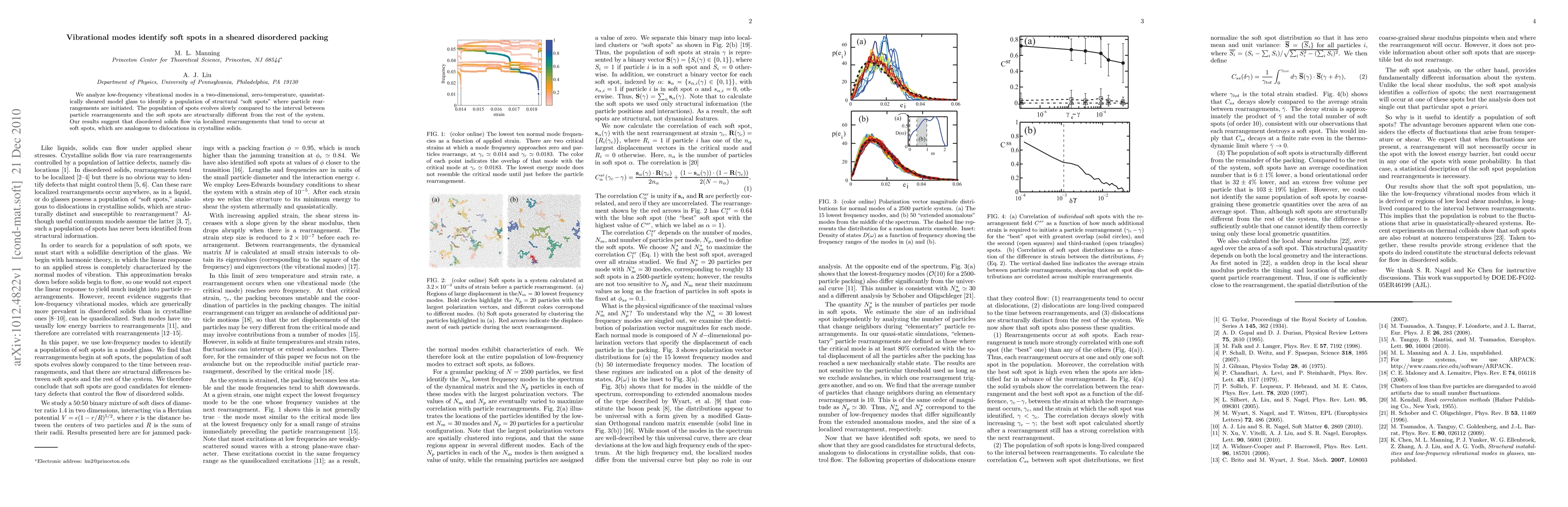 This study identifies "soft spots" in a sheared disordered packing through low-frequency vibrational modes, revealing that particle rearrangements initiating flow are localized at these distinct structural regions. The findings suggest that disordered solids flow via localized rearrangements at these analogous "soft spots" to dislocations in crystalline solids.