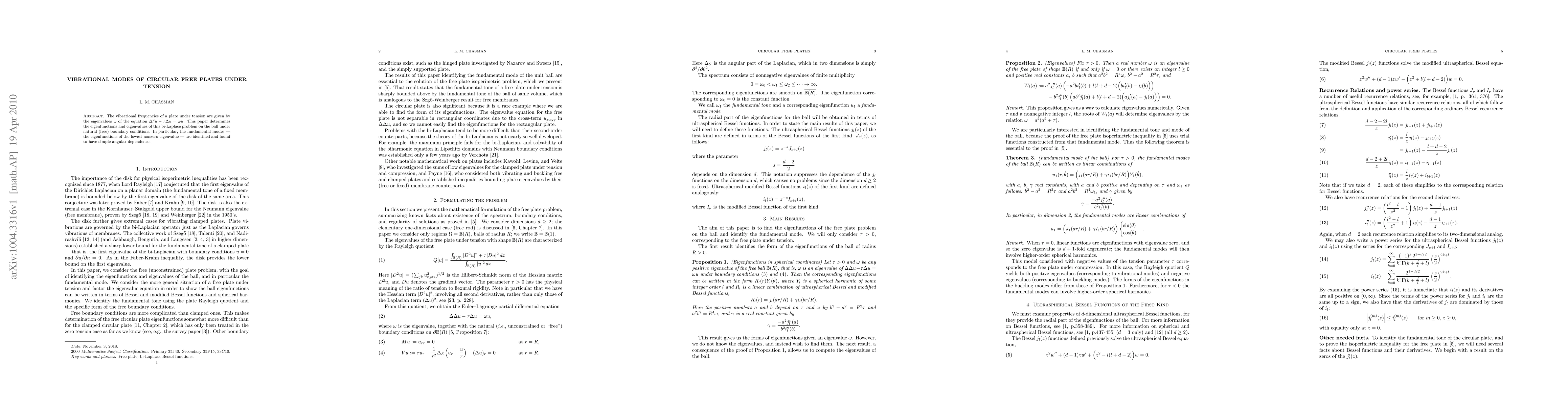 Researchers solved a bi-Laplace problem on a ball-shaped plate under tension to find its fundamental vibrational modes with simple angular dependence.