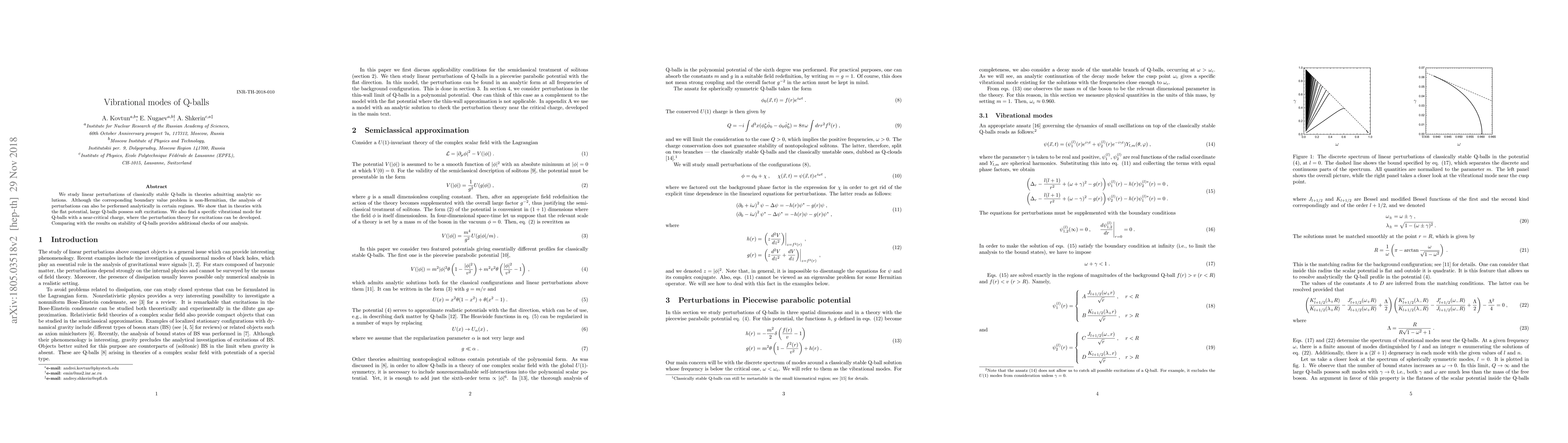 This paper investigates linear perturbations of stable Q-balls in analytic solutions, revealing soft excitations in large Q-balls with flat potentials and identifying a unique vibrational mode for near-critical charge Q-balls, supported by stability analysis comparisons.