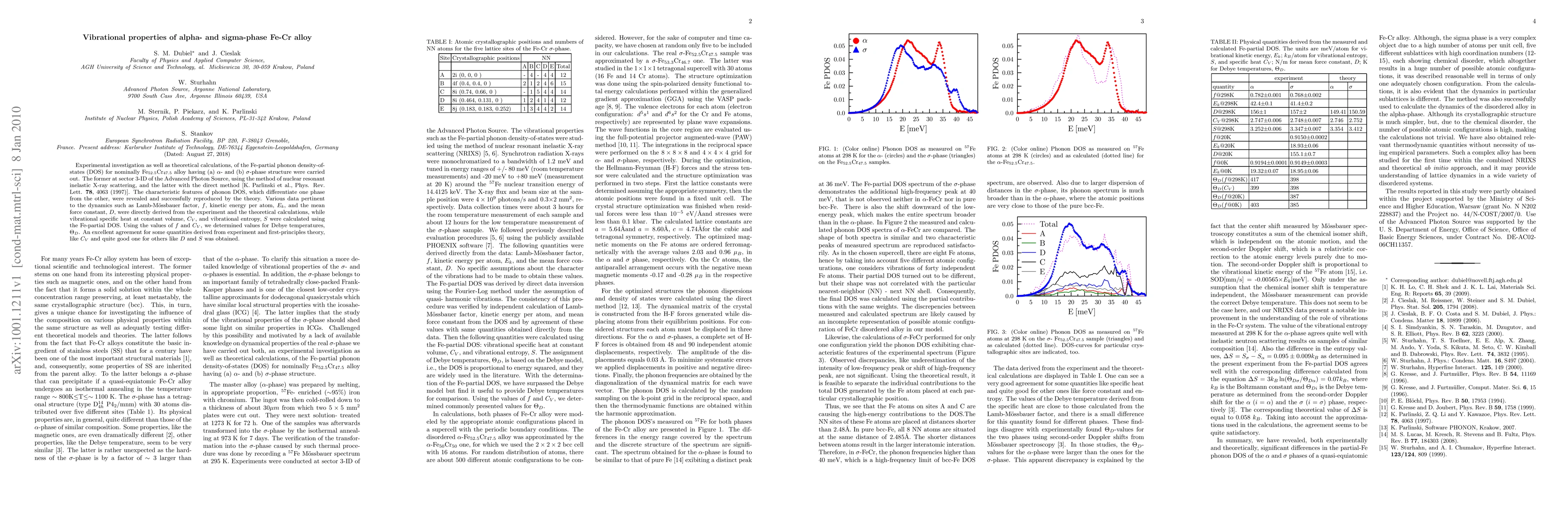 Experimental investigation as well as theoretical calculations, of the Fe-partial phonon density-of-states (DOS) for nominally Fe_52.5Cr_47.5 alloy having (a) alpha- and (b) sigma-phase structure were carried out. The former at sector 3-ID of the Advanced Photon Source, using the method of nuclear resonant inelastic X-ray scattering, and the latter with the direct method [K. Parlinski et al., Phys. Rev. Lett. {78, 4063 (1997)]. The characteristic features of phonon DOS, which differentiate one phase from the other, were revealed and successfully reproduced by the theory. Various data pertinent to the dynamics such as Lamb-Mossbauer factor, f, kinetic energy per atom, E_k, and the mean force constant, D, were directly derived from the experiment and the theoretical calculations, while vibrational specific heat at constant volume, C_V, and vibrational entropy, S were calculated using the Fe-partial DOS. Using the values of f and C_V, we determined values for Debye temperatures, T_D. An excellent agreement for some quantities derived from experiment and first-principles theory, like C_V and quite good one for others like D and S was obtained.