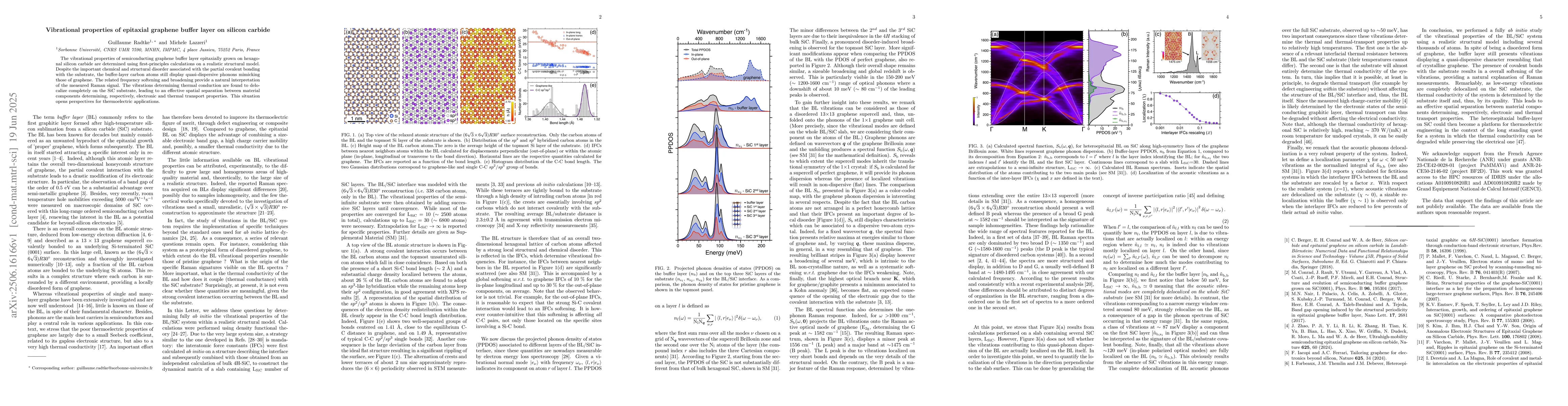 The study presents a detailed first-principles analysis of the vibrational properties of a disordered graphene buffer layer on SiC, revealing complete delocalization of thermal conduction vibrations onto the substrate.