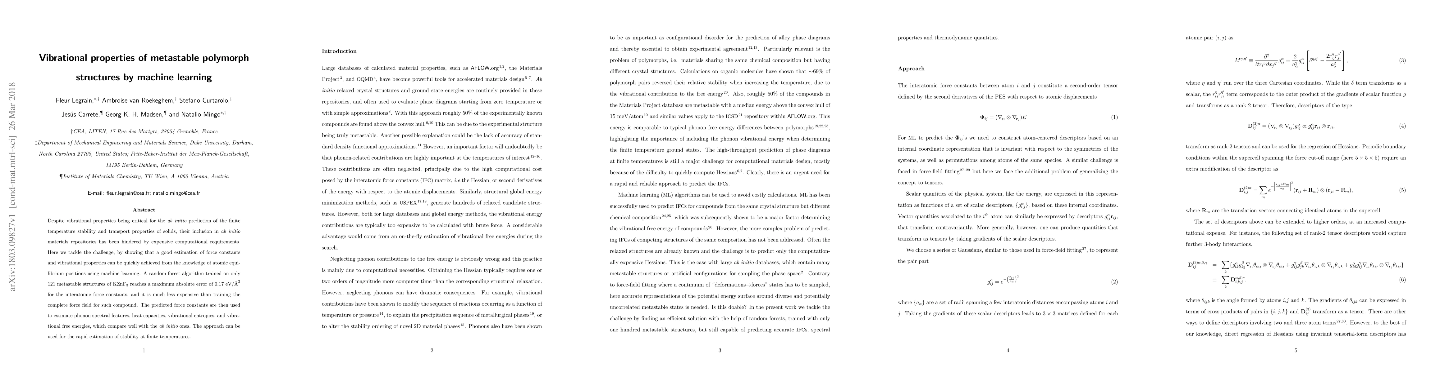 Despite vibrational properties being critical for the ab initio prediction of the finite temperature stability and transport properties of solids, their inclusion in ab initio materials repositories has been hindered by expensive computational requirements. Here we tackle the challenge, by showing that a good estimation of force constants and vibrational properties can be quickly achieved from the knowledge of atomic equilibrium positions using machine learning. A random-forest algorithm trained on only 121 metastable structures of KZnF$_3$ reaches a maximum absolute error of 0.17 eV/$\textrm\AA^2$ for the interatomic force constants, and it is much less expensive than training the complete force field for such compound. The predicted force constants are then used to estimate phonon spectral features, heat capacities, vibrational entropies, and vibrational free energies, which compare well with the ab initio ones. The approach can be used for the rapid estimation of stability at finite temperatures.