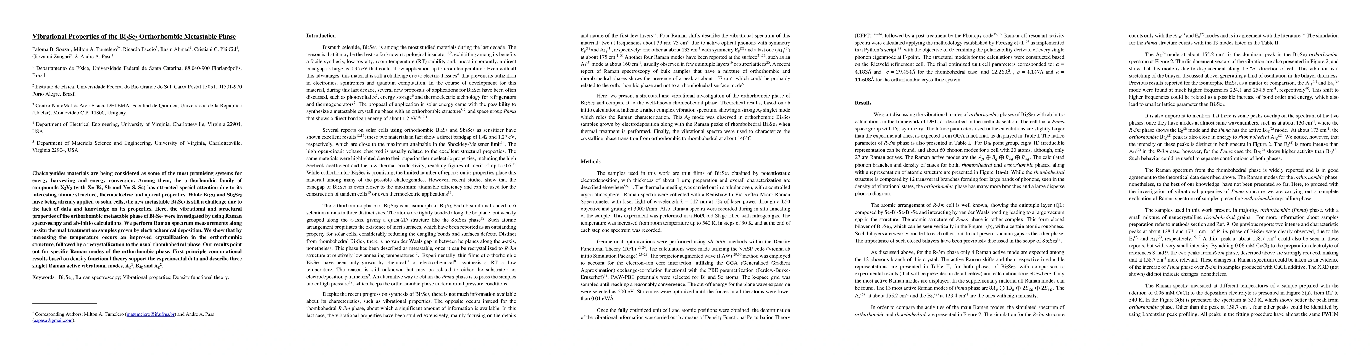 Chalcogenides materials are being considered as some of the most promising systems for energy harvesting and energy conversion. Among them, the orthorhombic family of compounds X2Y3 (with X= Bi, Sb and Y= S, Se) has attracted special attention due to its interesting atomic structure, thermoelectric and optical properties. While Bi2S3 and Sb2Se3 have being already applied to solar cells, the new metastable Bi2Se3 is still a challenge due to the lack of data and knowledge on its properties. Here, the vibrational and structural properties of the orthorhombic metastable phase of Bi2Se3 were investigated by using Raman spectroscopy and ab-initio calculations. We perform Raman spectrum measurements along in-situ thermal treatment on samples grown by electrochemical deposition. We show that by increasing the temperature occurs an improved crystallization in the orthorhombic structure, followed by a recrystallization to the usual rhombohedral phase. Our results point out for specific Raman modes of the orthorhombic phase. First principle computational results based on density functional theory support the experimental data and describe three singlet Raman active vibrational modes, Ag1, B2g and Ag2.