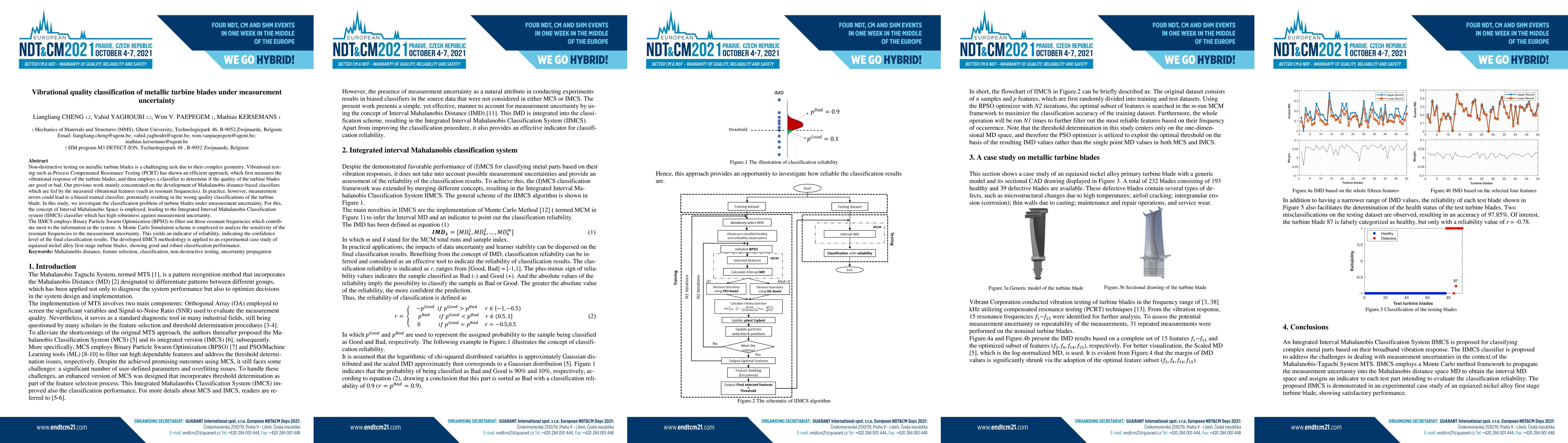 Non-destructive testing on metallic turbine blades is a challenging task due to their complex geometry. Vibrational test-ing such as Process Compensated Resonance Testing (PCRT) has shown an efficient approach, which first measures the vibrational response of the turbine blades, and then employs a classifier to determine if the quality of the turbine blades are good or bad. Our previous work mainly concentrated on the development of Mahalanobis distance-based classifiers which are fed by the measured vibrational features (such as resonant frequencies). In practice, however, measurement errors could lead to a biased trained classifier, potentially resulting in the wrong quality classifications of the turbine blade. In this study, we investigate the classification problem of turbine blades under measurement uncertainty. For this, the concept of Interval Mahalanobis Space is employed, leading to the Integrated Interval Mahalanobis Classification system (IIMCS) classifier which has high robustness against measurement uncertainty. The IIMCS employs Binary Particle Swarm Optimization (BPSO) to filter out those resonant frequencies which contrib-ute most to the information in the system. A Monte Carlo Simulation scheme is employed to analyze the sensitivity of the resonant frequencies to the measurement uncertainty. This yields an indicator of reliability, indicating the confidence level of the final classification results. The developed IIMCS methodology is applied to an experimental case study of equiaxed nickel alloy first-stage turbine blades, showing good and robust classification performance.