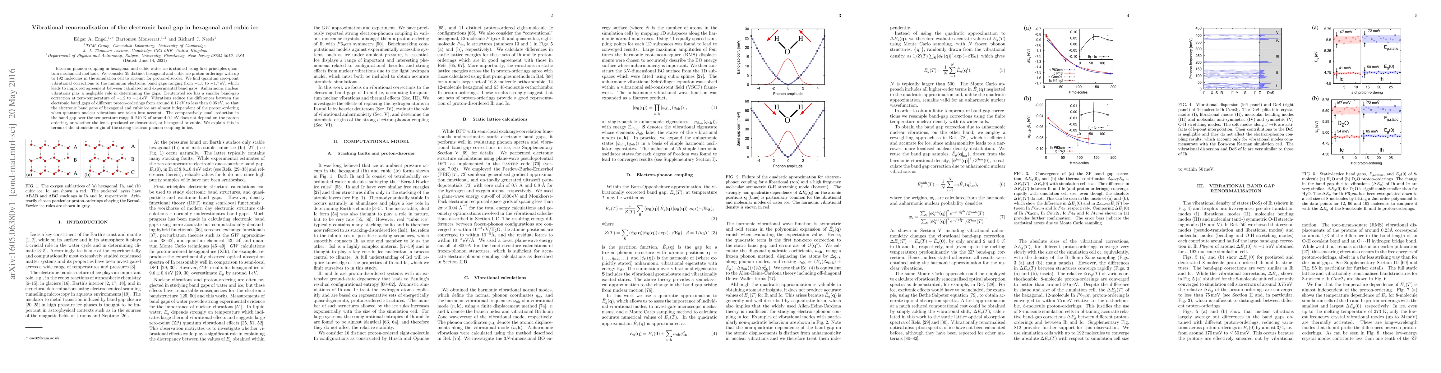 This study investigates electron-phonon coupling in hexagonal and cubic ice using quantum mechanical methods, revealing significant quantum zero-point vibrational corrections to electronic band gaps, which improve agreement with experimental data. The research shows that anharmonic nuclear vibrations have minimal impact, and deuterated ice exhibits smaller band-gap corrections.