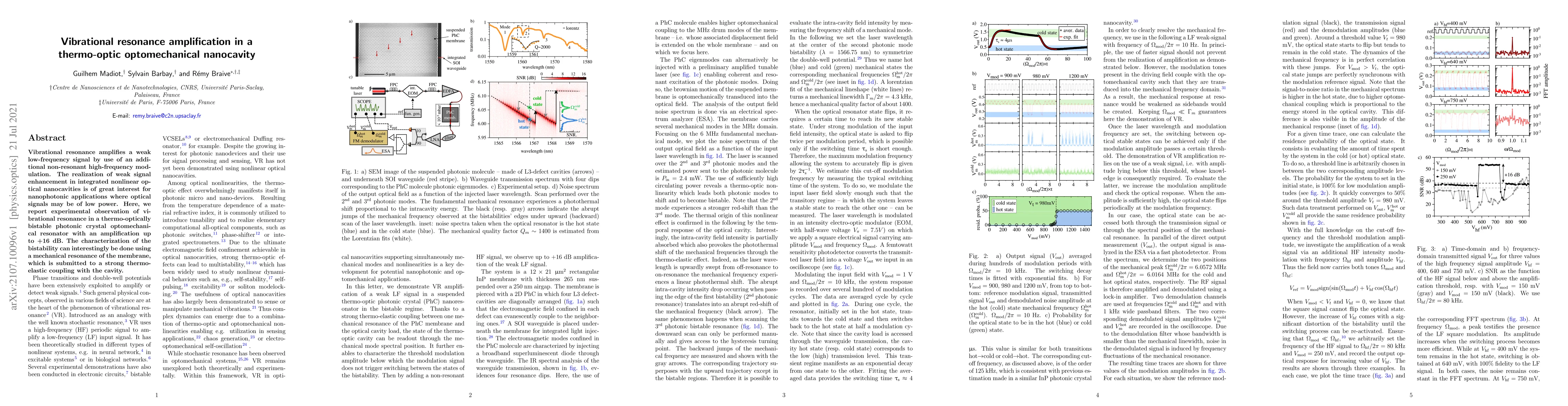 Researchers observed a +16 dB amplification of weak signals in a thermo-optic optomechanical nanocavity using vibrational resonance. This breakthrough has implications for low-power nanophotonic applications.