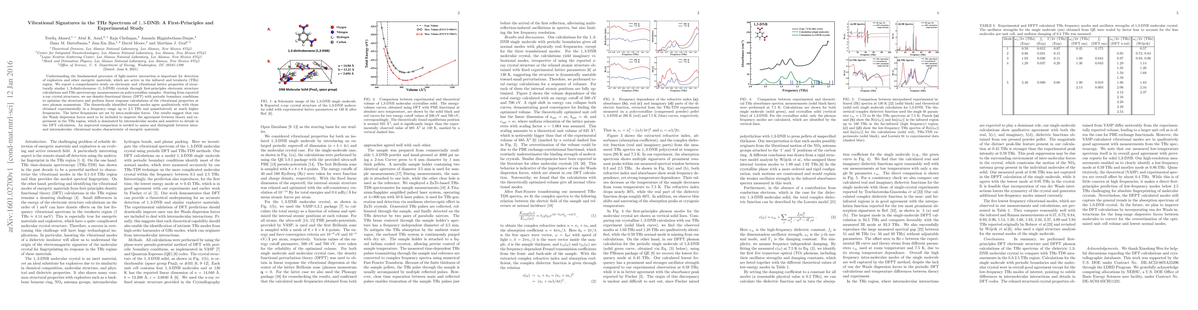 This study combines first-principles calculations and THz spectroscopy to investigate the vibrational signatures of 1,3-dinitrobenzene (1,3-DNB) crystals, revealing discrepancies between theoretical predictions and experimental data in the THz region that suggest the need for including van der Waals forces in the calculations.
