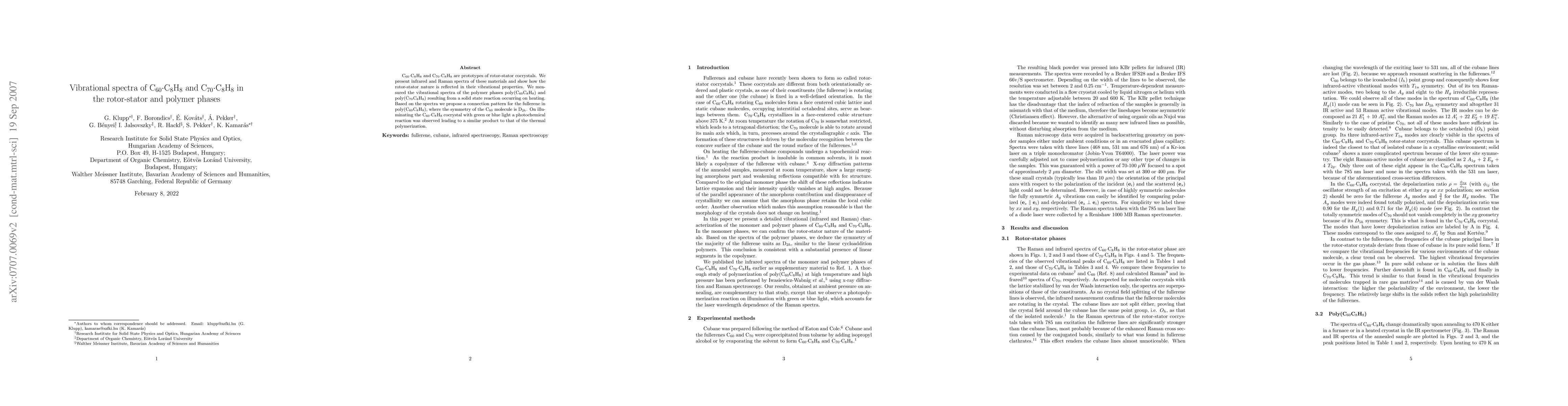 C60-C8H8 and C70-C8H8 are prototypes of rotor-stator cocrystals. We present infrared and Raman spectra of these materials and show how the rotor-stator nature is reflected in their vibrational properties. We measured the vibrational spectra of the polymer phases poly(C60C8H8) and poly(C70C8H8) resulting from a solid state reaction occurring on heating. Based on the spectra we propose a connection pattern for the fullerene in poly(C60C8H8), where the symmetry of the C60 is D2h. On illuminating the C60-C8H8 cocrystal with green or blue light a photochemical reaction was observed leading to a similar product to that of the thermal polymerization.