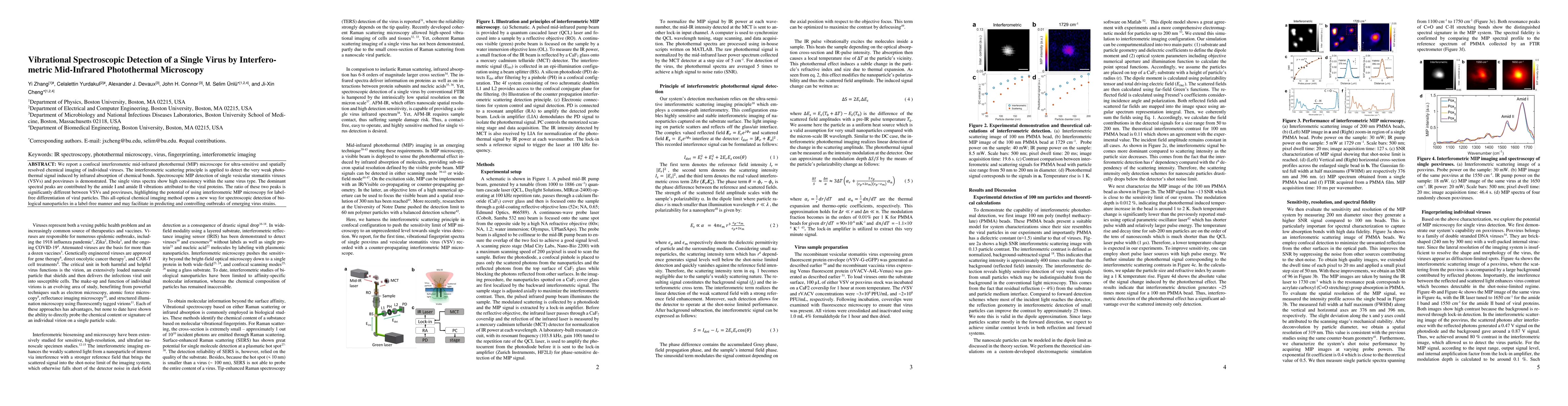 This study introduces a confocal interferometric mid-infrared photothermal microscope for label-free detection of single viruses, demonstrating consistent spectra for vesicular stomatitis virus and poxvirus with distinct amide vibration peak ratios, showing potential for differentiating viral particles and predicting virus outbreaks.