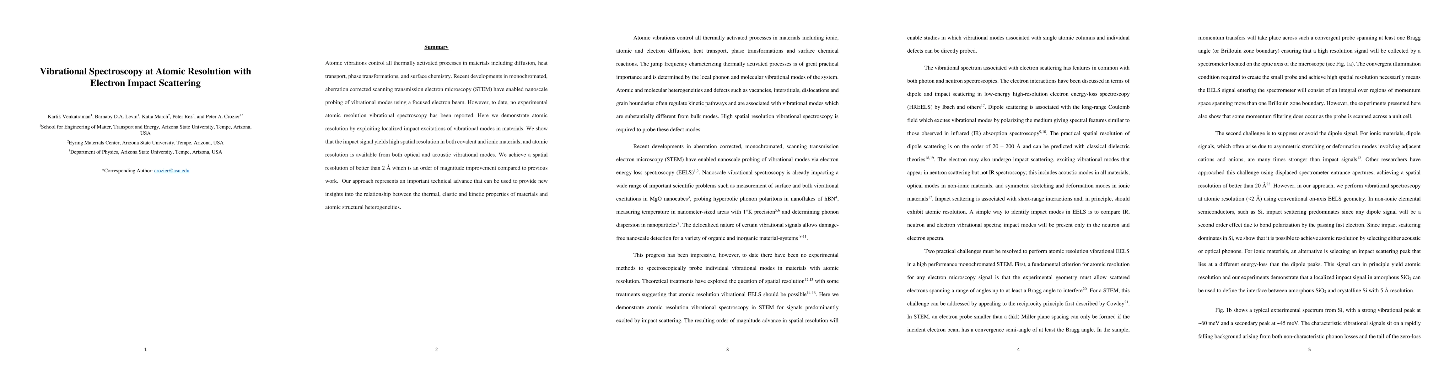This paper demonstrates atomic resolution vibrational spectroscopy using electron impact scattering in monochromated, aberration-corrected scanning transmission electron microscopy (STEM). The study achieves a spatial resolution of better than 2 Å, significantly improving previous methods, and provides insights into the thermal, elastic, and kinetic properties of materials.