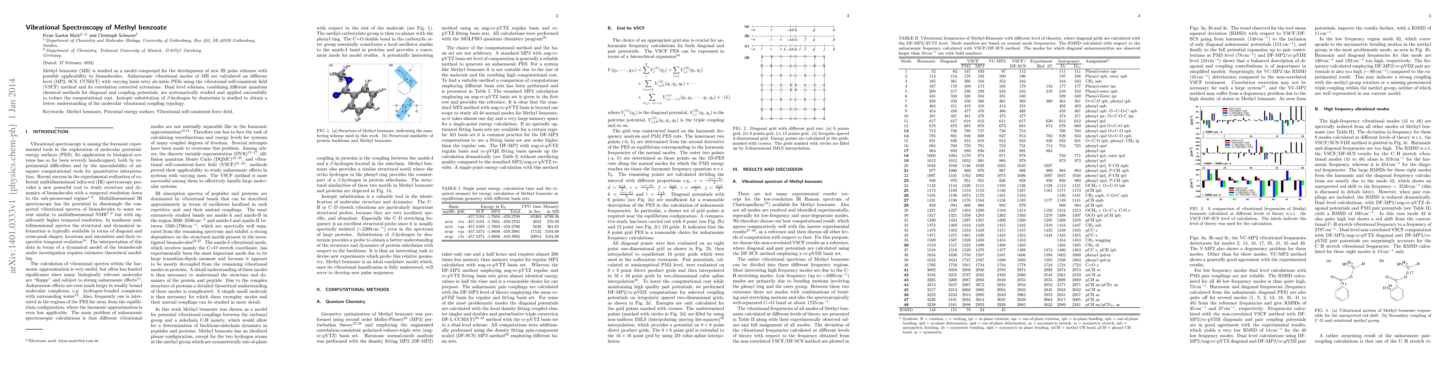 Methyl benzoate (MB) is studied as a model compound for the development of new IR pulse schemes with possible applicability to biomolecules. Anharmonic vibrational modes of MB are calculated on different level (MP2, SCS, CCSD(T) with varying basis sets) ab-initio PESs using the vibrational self-consistent field (VSCF) method and its correlation corrected extensions. Dual level schemes, combining different quantum chemical methods for diagonal and coupling potentials, are systematically studied and applied successfully to reduce the computational cost. Isotopic substitution of {\beta}-hydrogen by deuterium is studied to obtain a better understanding of the molecular vibrational coupling topology.