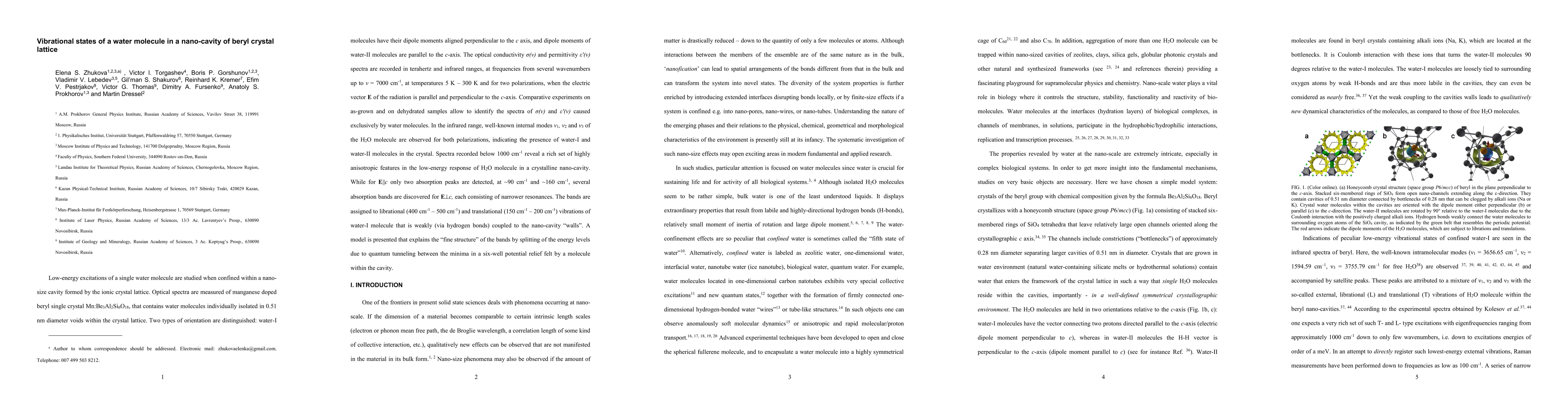 This study investigates the vibrational states of isolated water molecules confined within nano-cavities in a manganese-doped beryl crystal lattice. The research reveals distinct spectral features in the terahertz and infrared ranges, attributing the low-energy response to librational and translational vibrations of water molecules, with a model explaining the observed fine structure via quantum tunneling in a six-well potential.