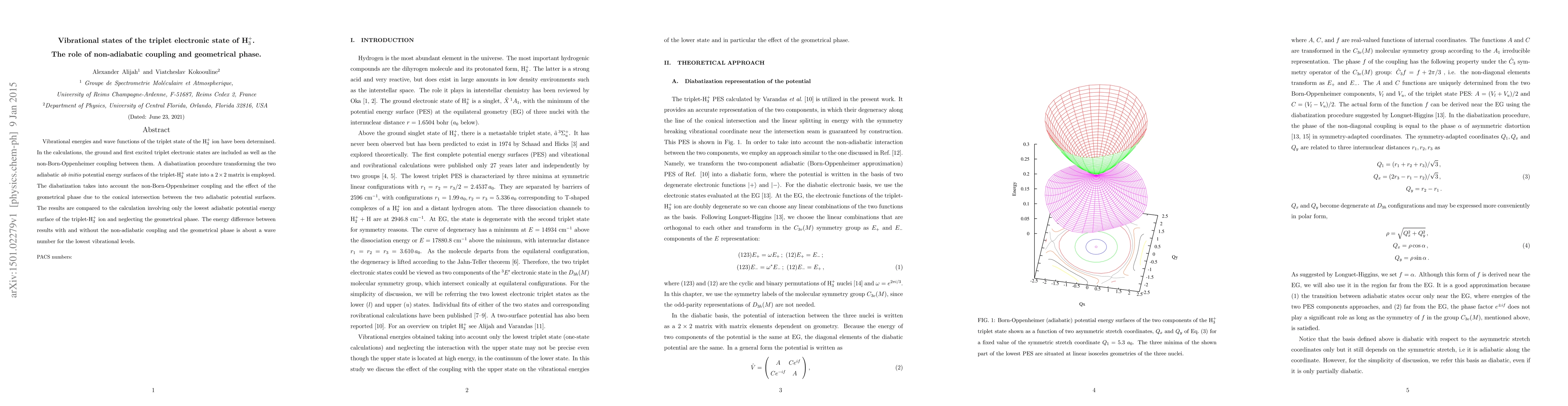 The research determines vibrational energies and wave functions of the triplet state of H3+ ion, including ground and first excited triplet electronic states, and non-Born-Oppenheimer coupling between them. A diabatization procedure is employed to transform two adiabatic ab initio potential energy surfaces into a 2x2 matrix, accounting for non-Born-Oppenheimer coupling and geometrical phase due to conical intersection.