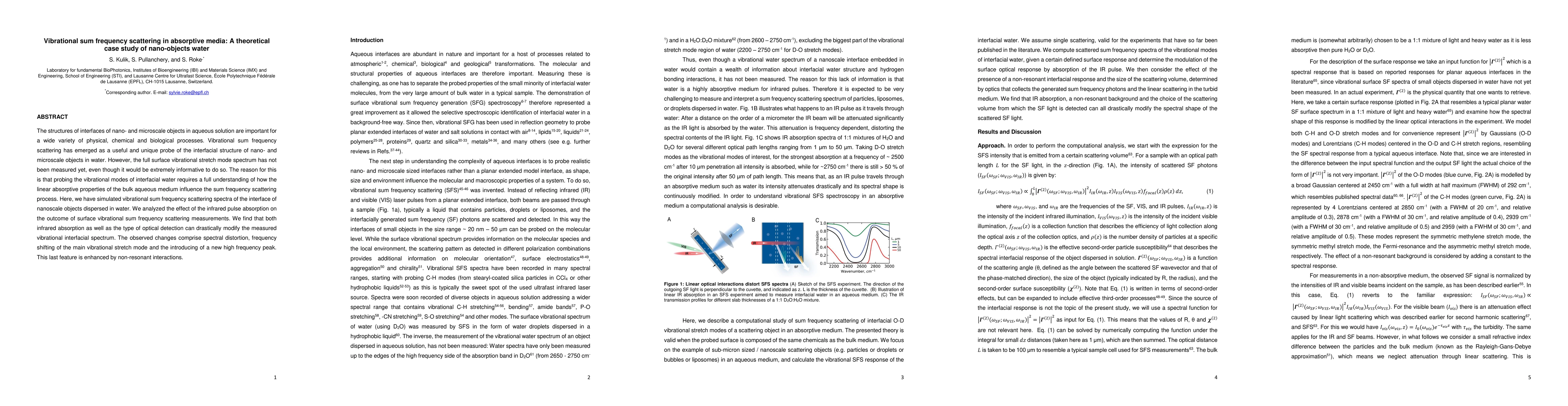 The structures of interfaces of nano- and microscale objects in aqueous solution are important for a wide variety of physical, chemical and biological processes. Vibrational sum frequency scattering has emerged as a useful and unique probe of the interfacial structure of nano- and microscale objects in water. However, the full surface vibrational stretch mode spectrum has not been measured yet, even though it would be extremely informative to do so. The reason for this is that probing the vibrational modes of interfacial water requires a full understanding of how the linear absorptive properties of the bulk aqueous medium influence the sum frequency scattering process. Here, we have simulated vibrational sum frequency scattering spectra of the interface of nanoscale objects dispersed in water. We analyzed the effect of the infrared pulse absorption on the outcome of surface vibrational sum frequency scattering measurements. We find that both infrared absorption as well as the type of optical detection can drastically modify the measured vibrational interfacial spectrum. The observed changes comprise spectral distortion, frequency shifting of the main vibrational stretch mode and the introducing of a new high frequency peak. This last feature is enhanced by non-resonant interactions.
