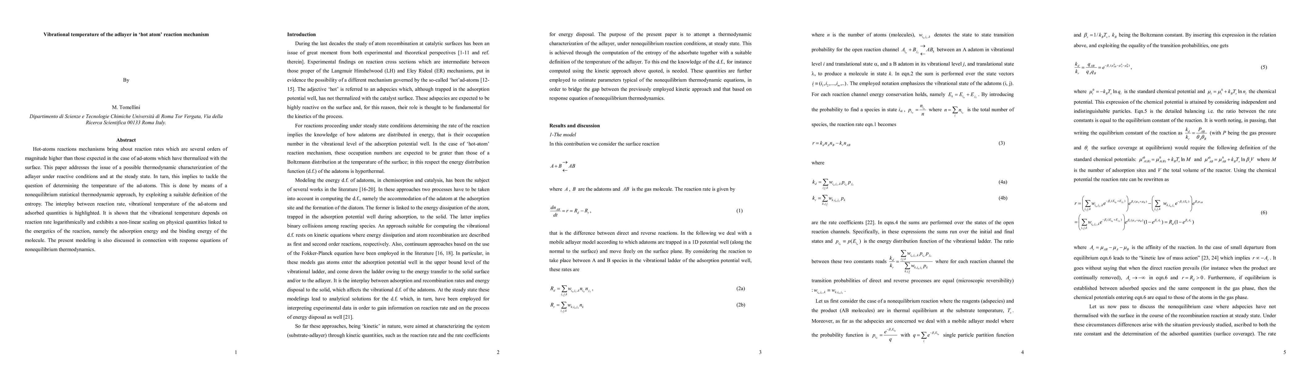 Hot-atoms reactions mechanisms bring about reaction rates which are several orders of magnitude higher than those expected in the case of ad-atoms which have thermalized with the surface. This paper addresses the issue of a possible thermodynamic characterization of the adlayer under reactive conditions and at the steady state. In turn, this implies to tackle the question of determining the temperature of the ad-atoms. This is done by means of a nonequilibrium statistical thermodynamic approach, by exploiting a suitable definition of the entropy. The interplay between reaction rate, vibrational temperature of the ad-atoms and adsorbed quantities is highlighted. It is shown that the vibrational temperature depends on reaction rate logarithmically and exhibits a non-linear scaling on physical quantities linked to the energetics of the reaction, namely the adsorption energy and the binding energy of the molecule. The present modeling is also discussed in connection with response equations of nonequilibrium thermodynamics.