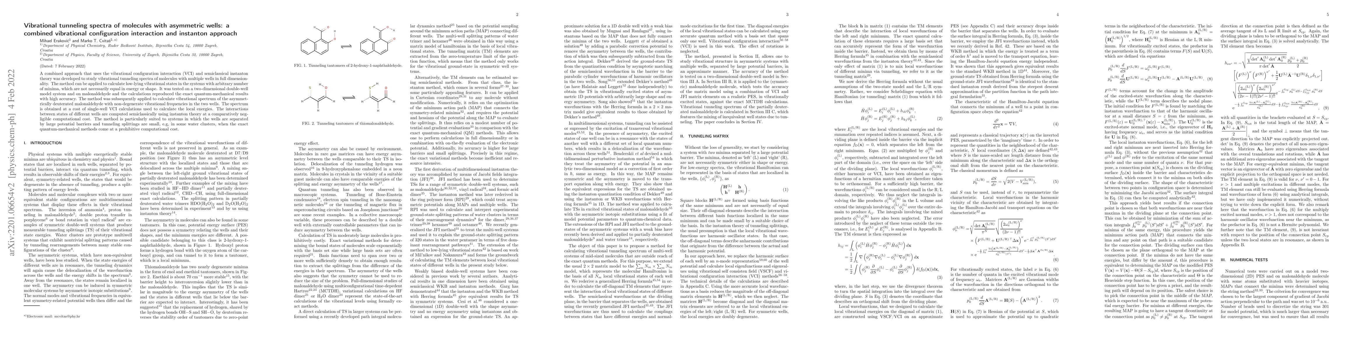 This paper develops a combined VSCF/VCI and instanton theory approach to study vibrational tunneling spectra in asymmetric wells, allowing for the calculation of low-lying states in systems with multiple wells. The method is tested on model systems and malonaldehyde, showing accuracy compared to exact quantum-mechanical calculations, and is particularly effective for systems with large potential barriers and small tunneling splittings.