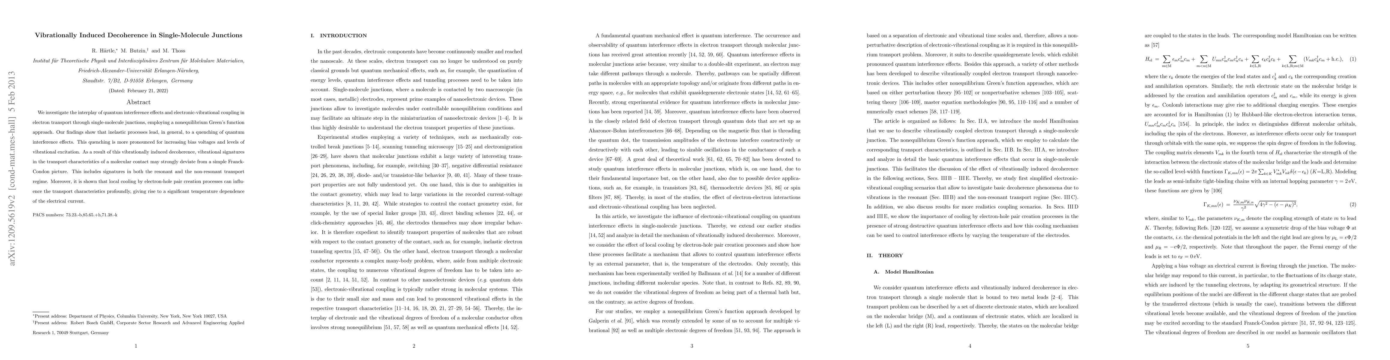 This paper explores how electron transport in single-molecule junctions is affected by electronic-vibrational coupling and decoherence, revealing that inelastic processes suppress quantum interference, especially at higher bias voltages and vibrational excitations, leading to significant deviations from a simple Franck-Condon model and a notable temperature dependence of electrical current due to local cooling from electron-hole pair creation.
