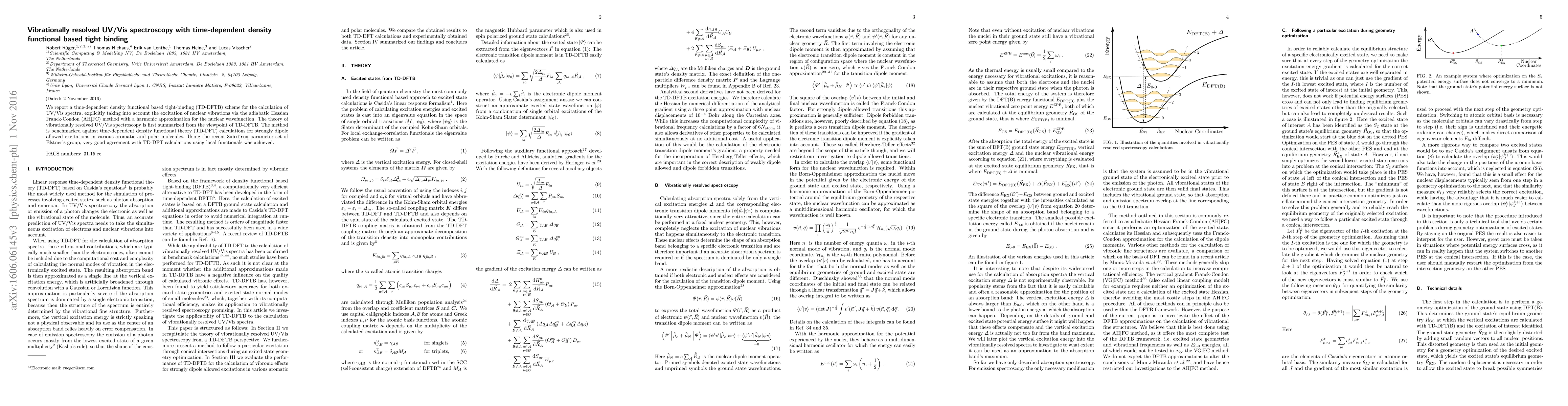 This paper presents a TD-DFTB method for calculating vibrationally resolved UV/Vis spectra, incorporating the AH|FC approach for nuclear vibrations. Benchmarking against TD-DFT shows good agreement for strongly dipole-allowed excitations in aromatic and polar molecules.