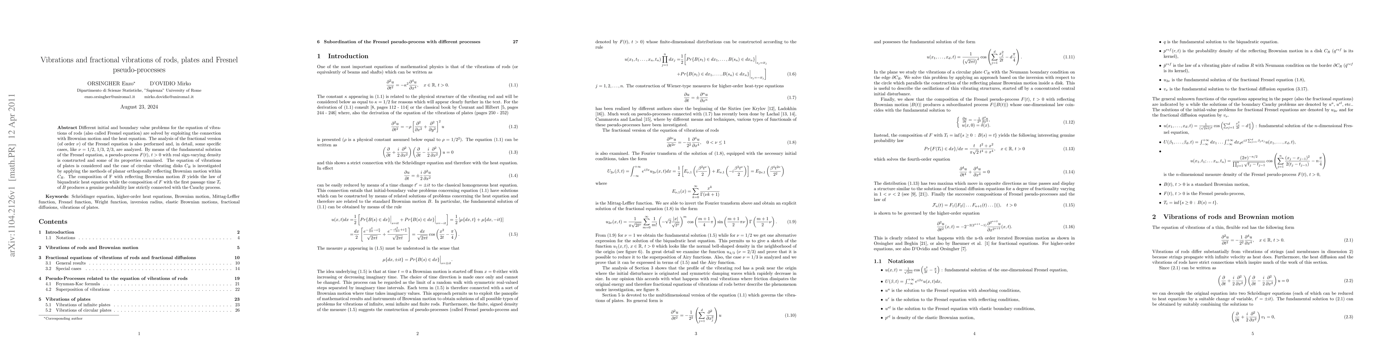 Different initial and boundary value problems for the equation of vibrations of rods (also called Fresnel equation) are solved by exploiting the connection with Brownian motion and the heat equation. The analysis of the fractional version (of order $\nu$) of the Fresnel equation is also performed and, in detail, some specific cases, like $\nu=1/2$, 1/3, 2/3, are analyzed. By means of the fundamental solution of the Fresnel equation, a pseudo-process $F(t)$, $t>0$ with real sign-varying density is constructed and some of its properties examined. The equation of vibrations of plates is considered and the case of circular vibrating disks $C_R$ is investigated by applying the methods of planar orthogonally reflecting Brownian motion within $C_R$. The composition of F with reflecting Brownian motion $B$ yields the law of biquadratic heat equation while the composition of $F$ with the first passage time $T_t$ of $B$ produces a genuine probability law strictly connected with the Cauchy process.