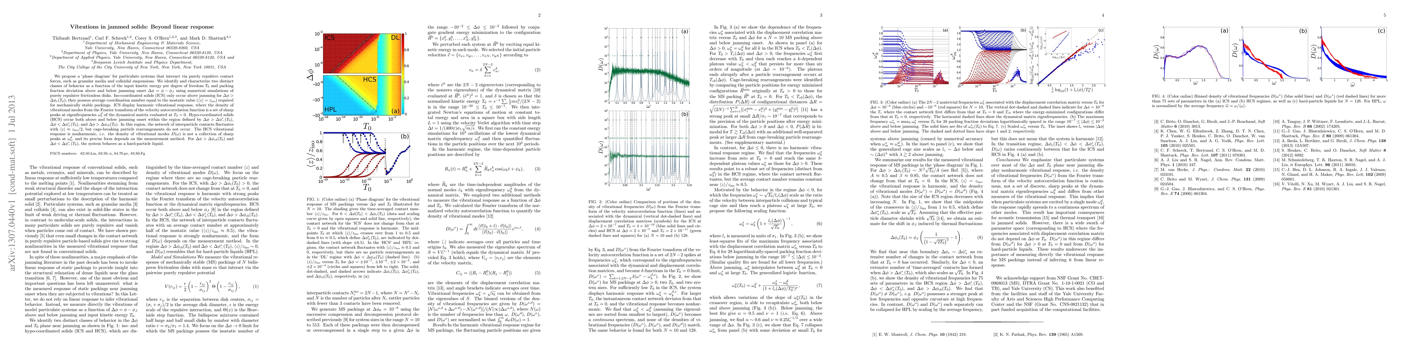 We propose a `phase diagram' for particulate systems that interact via purely repulsive contact forces, such as granular media and colloidal suspensions. We identify and characterize two distinct classes of behavior as a function of the input kinetic energy per degree of freedom $T_0$ and packing fraction deviation above and below jamming onset $\Delta \phi=\phi - \phi_J$ using numerical simulations of purely repulsive frictionless disks. Iso-coordinated solids (ICS) only occur above jamming for $\Delta \phi > \Delta \phi_c(T_0)$; they possess average coordination number equal to the isostatic value ($< z> = z_{\rm iso}$) required for mechanically stable packings. ICS display harmonic vibrational response, where the density of vibrational modes from the Fourier transform of the velocity autocorrelation function is a set of sharp peaks at eigenfrequencies $\omega_k^d$ of the dynamical matrix evaluated at $T_0=0$. Hypo-coordinated solids (HCS) occur both above and below jamming onset within the region defined by $\Delta \phi > \Delta \phi^*_-(T_0)$, $\Delta \phi < \Delta \phi^*_+(T_0)$, and $\Delta \phi > \Delta \phi_{cb}(T_0)$. In this region, the network of interparticle contacts fluctuates with $< z> \approx z_{\rm iso}/2$, but cage-breaking particle rearrangements do not occur. The HCS vibrational response is nonharmonic, {\it i.e} the density of vibrational modes $D(\omega)$ is not a collection of sharp peaks at $\omega_k^d$, and its precise form depends on the measurement method. For $\Delta \phi > \Delta \phi_{cb}(T_0)$ and $\Delta \phi < \Delta \phi^*_{-}(T_0)$, the system behaves as a hard-particle liquid.