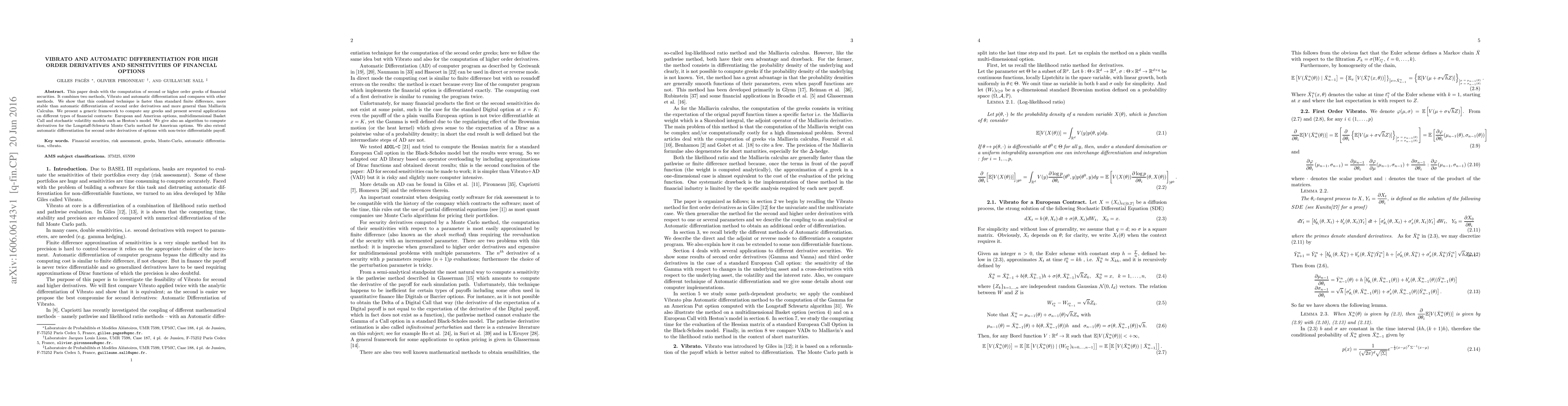 This paper deals with the computation of second or higher order greeks of financial securities. It combines two methods, Vibrato and automatic differentiation and compares with other methods. We show that this combined technique is faster than standard finite difference, more stable than automatic differentiation of second order derivatives and more general than Malliavin Calculus. We present a generic framework to compute any greeks and present several applications on different types of financial contracts: European and American options, multidimensional Basket Call and stochastic volatility models such as Heston's model. We give also an algorithm to compute derivatives for the Longstaff-Schwartz Monte Carlo method for American options. We also extend automatic differentiation for second order derivatives of options with non-twice differentiable payoff. 1. Introduction. Due to BASEL III regulations, banks are requested to evaluate the sensitivities of their portfolios every day (risk assessment). Some of these portfolios are huge and sensitivities are time consuming to compute accurately. Faced with the problem of building a software for this task and distrusting automatic differentiation for non-differentiable functions, we turned to an idea developed by Mike Giles called Vibrato. Vibrato at core is a differentiation of a combination of likelihood ratio method and pathwise evaluation. In Giles [12], [13], it is shown that the computing time, stability and precision are enhanced compared with numerical differentiation of the full Monte Carlo path. In many cases, double sensitivities, i.e. second derivatives with respect to parameters, are needed (e.g. gamma hedging). Finite difference approximation of sensitivities is a very simple method but its precision is hard to control because it relies on the appropriate choice of the increment. Automatic differentiation of computer programs bypass the difficulty and its computing cost is similar to finite difference, if not cheaper. But in finance the payoff is never twice differentiable and so generalized derivatives have to be used requiring approximations of Dirac functions of which the precision is also doubtful. The purpose of this paper is to investigate the feasibility of Vibrato for second and higher derivatives. We will first compare Vibrato applied twice with the analytic differentiation of Vibrato and show that it is equivalent, as the second is easier we propose the best compromise for second derivatives: Automatic Differentiation of Vibrato. In [8], Capriotti has recently investigated the coupling of different mathematical methods -- namely pathwise and likelihood ratio methods -- with an Automatic differ