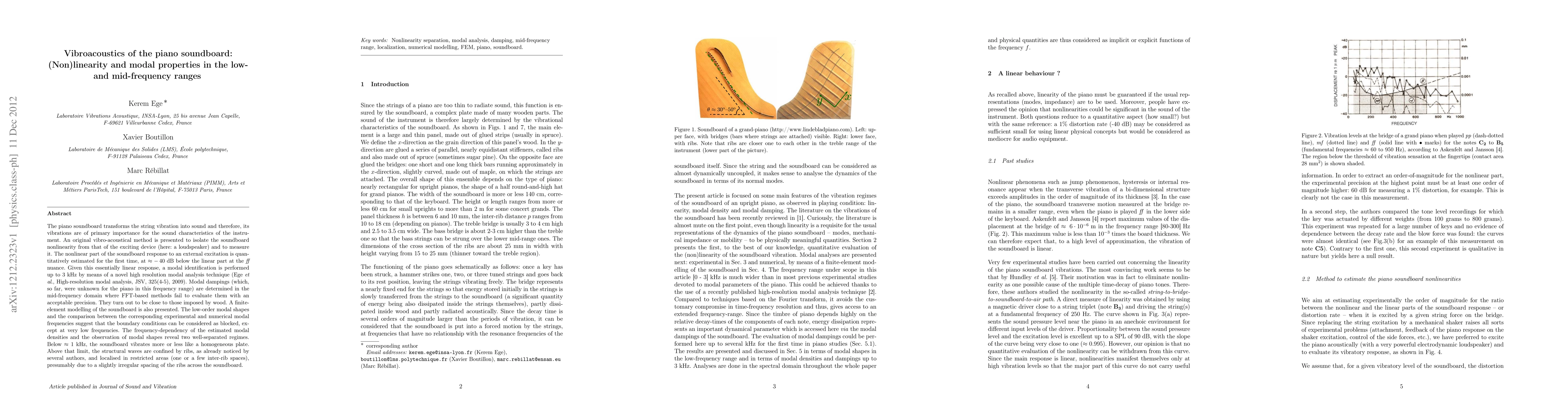 The piano soundboard transforms the string vibration into sound and therefore, its vibrations are of primary importance for the sound characteristics of the instrument. An original vibro-acoustical method is presented to isolate the soundboard nonlinearity from that of the exciting device (here: a loudspeaker) and to measure it. The nonlinear part of the soundboard response to an external excitation is quantitatively estimated for the first time, at \approx -40 dB below the linear part at the ff nuance. Given this essentially linear response, a modal identification is performed up to 3 kHz by means of a novel high resolution modal analysis technique (Ege et al., High-resolution modal analysis, JSV, 325(4-5), 2009). Modal dampings (which, so far, were unknown for the piano in this frequency range) are determined in the midfrequency domain where FFT-based methods fail to evaluate them with an acceptable precision. They turn out to be close to those imposed by wood. A finite-element modelling of the soundboard is also presented. The low-order modal shapes and the comparison between the corresponding experimental and numerical modal frequencies suggest that the boundary conditions can be considered as blocked, except at very low frequencies. The frequency-dependency of the modal density and the observation of modal shapes reveal two well-separated regimes. Below \approx 1 kHz, the soundboard vibrates more or less like a homogeneous plate. Above that limit, the structural waves are confined by ribs, as already noticed by several authors, and localised in restricted areas (one or a few inter-rib spaces), presumably due to a slightly irregular spacing of the ribs across the soundboard.