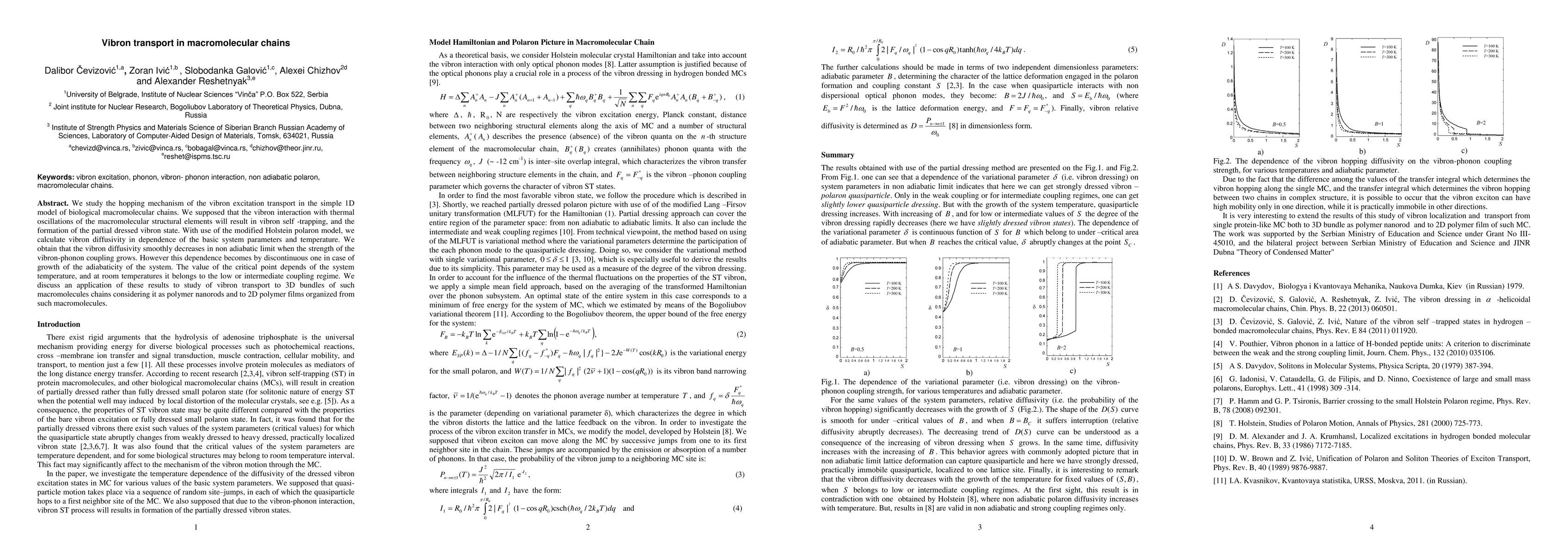 We study the hopping mechanism of the vibron excitation transport in the simple 1D model of biological macromolecular chains. We supposed that the vibron interaction with thermal oscillations of the macromolecular structural elements will result in vibron self -trapping, and the formation of the partial dressed vibron state. With use of the modified Holstein polaron model, we calculate vibron diffusivity in dependence of the basic system parameters and temperature. We obtain that the vibron diffusivity smoothly decreases in non adiabatic limit when the strength of the vibron-phonon coupling grows. However this dependence becomes by discontinuous one in case of growth of the adiabaticity of the system. The value of the critical point depends of the system temperature, and at room temperatures it belongs to the low or intermediate coupling regime. We discuss an application of these results to study of vibron transport to 3D bundles of such macromolecules chains considering it as polymer nanorods and to 2D polymer films organized from such macromolecules.
