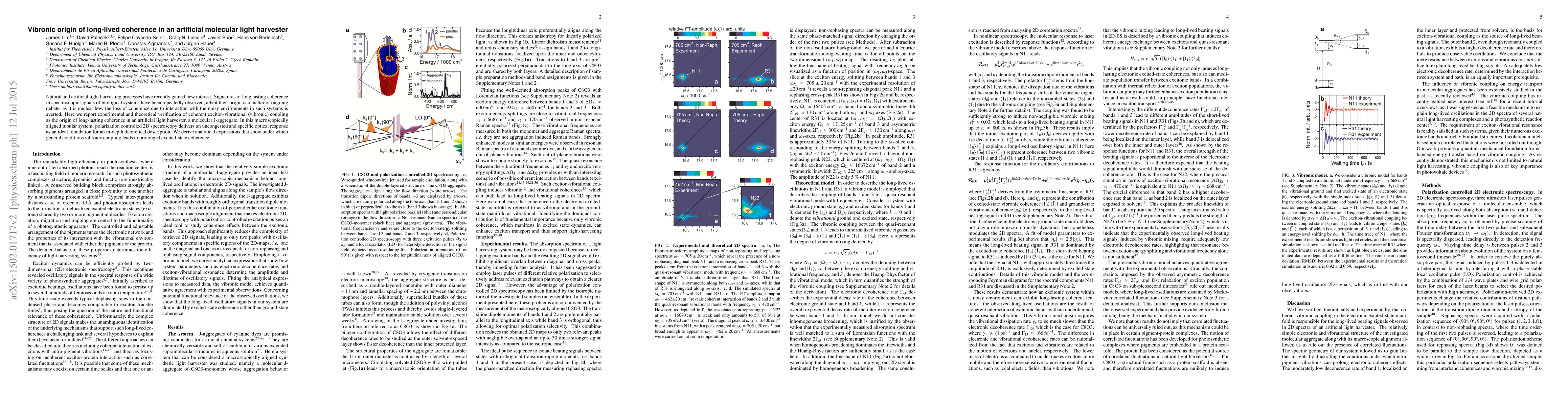 This paper investigates the origin of long-lived coherence in an artificial molecular light harvester, identifying coherent exciton-vibrational coupling as the key factor. The study combines experimental and theoretical approaches to demonstrate that vibronic coupling in a molecular J-aggregate maintains coherence despite environmental interactions, providing a foundation for future light-harvesting technologies.