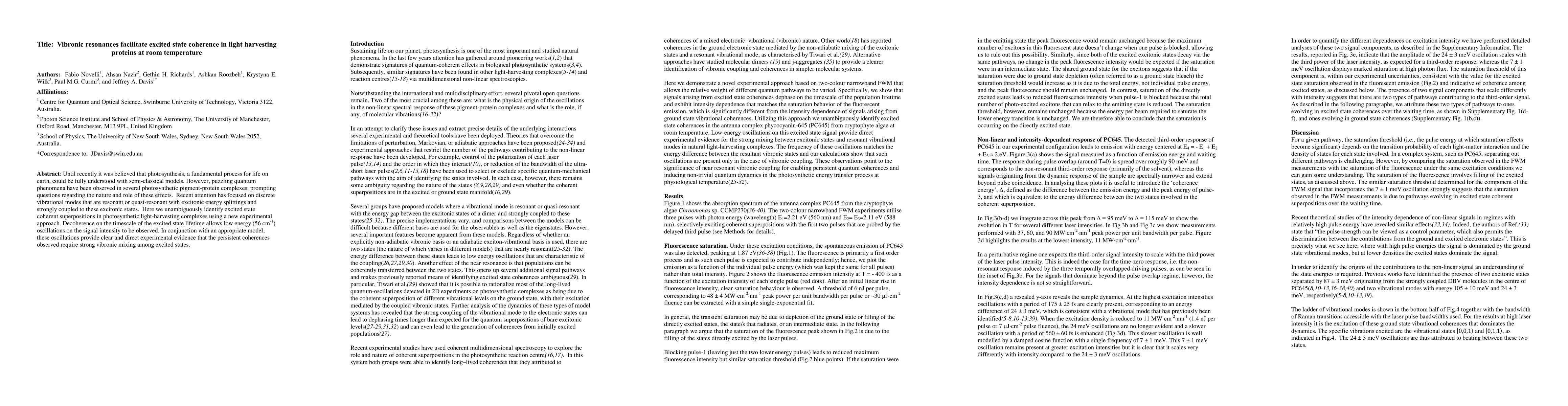 Until recently it was believed that photosynthesis, a fundamental process for life on earth, could be fully understood with semi-classical models. However, puzzling quantum phenomena have been observed in several photosynthetic pigment-protein complexes, prompting questions regarding the nature and role of these effects. Recent attention has focused on discrete vibrational modes that are resonant or quasi-resonant with excitonic energy splittings and strongly coupled to these excitonic states. Here we unambiguously identify excited state coherent superpositions in photosynthetic light-harvesting complexes using a new experimental approach. Decoherence on the timescale of the excited state lifetime allows low energy (56 cm-1) oscillations on the signal intensity to be observed. In conjunction with an appropriate model, these oscillations provide clear and direct experimental evidence that the persistent coherences observed require strong vibronic mixing among excited states.