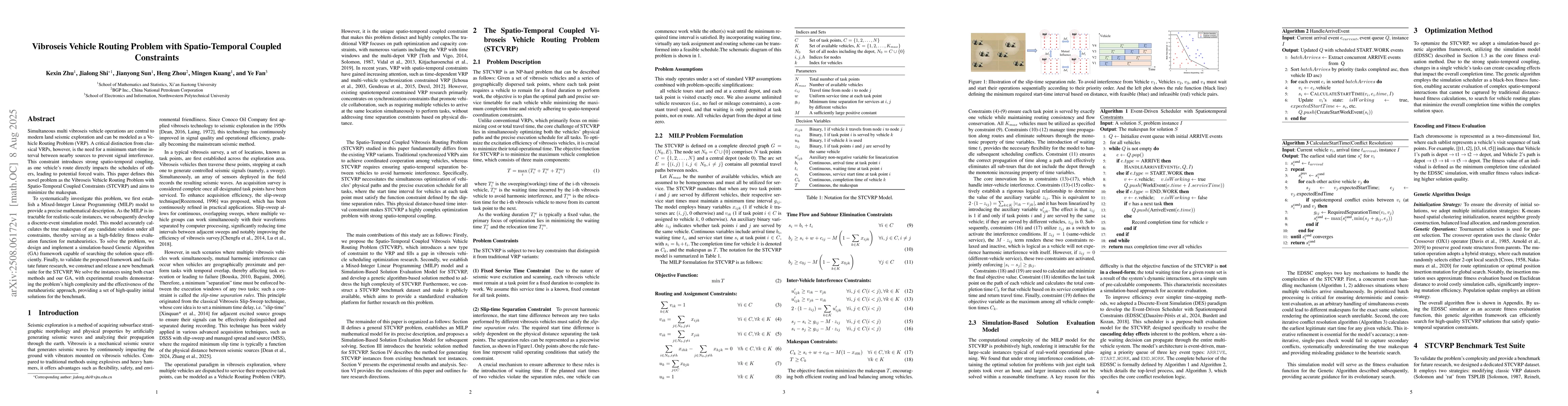 Simultaneous multi vibroseis vehicle operations are central to modern land seismic exploration and can be modeled as a Vehicle Routing Problem (VRP). A critical distinction from classical VRPs, however, is the need for a minimum start-time interval between nearby sources to prevent signal interference. This constraint introduces strong spatio-temporal coupling, as one vehicle's route directly impacts the schedules of others, leading to potential forced waits. This paper defines this novel problem as the Vibroseis Vehicle Routing Problem with Spatio-Temporal Coupled Constraints (STCVRP) and aims to minimize the makespan. To systematically investigate this problem, we first establish a Mixed-Integer Linear Programming (MILP) model to provide a precise mathematical description. As the MILP is intractable for realistic-scale instances, we subsequently develop a discrete-event simulation model. This model accurately calculates the true makespan of any candidate solution under all constraints, thereby serving as a high-fidelity fitness evaluation function for metaheuristics. To solve the problem, we design and implement a simulation-based Genetic Algorithm (GA) framework capable of searching the solution space efficiently. Finally, to validate the proposed framework and facilitate future research, we construct and release a new benchmark suite for the STCVRP. We solve the instances using both exact methods and our GA, with experimental results demonstrating the problem's high complexity and the effectiveness of the metaheuristic approach, providing a set of high-quality initial solutions for the benchmark.