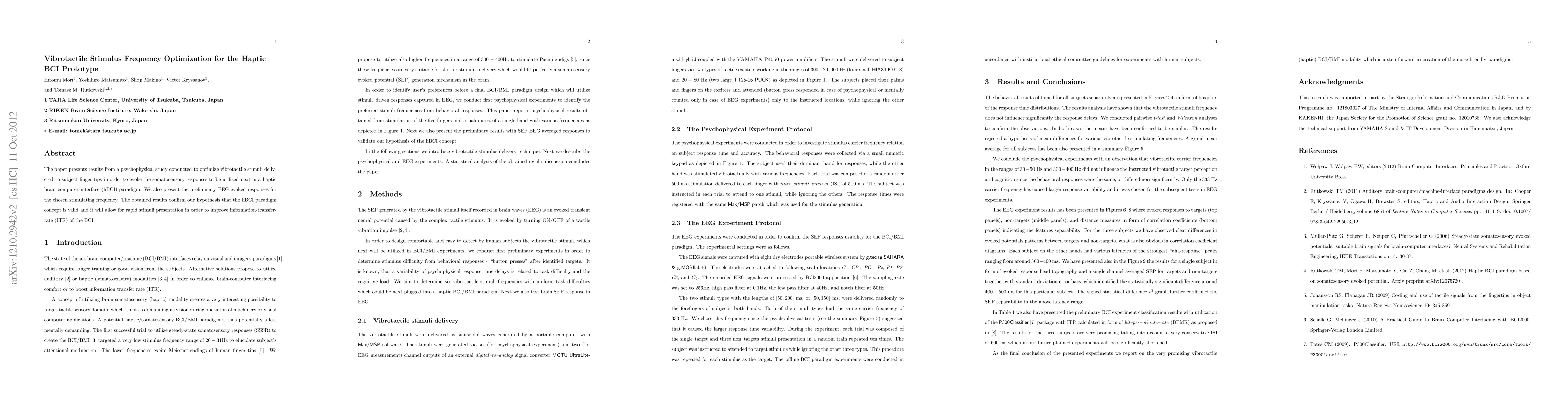 This study optimizes vibrotactile frequencies for haptic brain-computer interfaces (hBCI), confirming the concept's validity through psychophysical tests and preliminary EEG responses. It suggests rapid stimulus presentation can boost BCI information-transfer-rate (ITR).