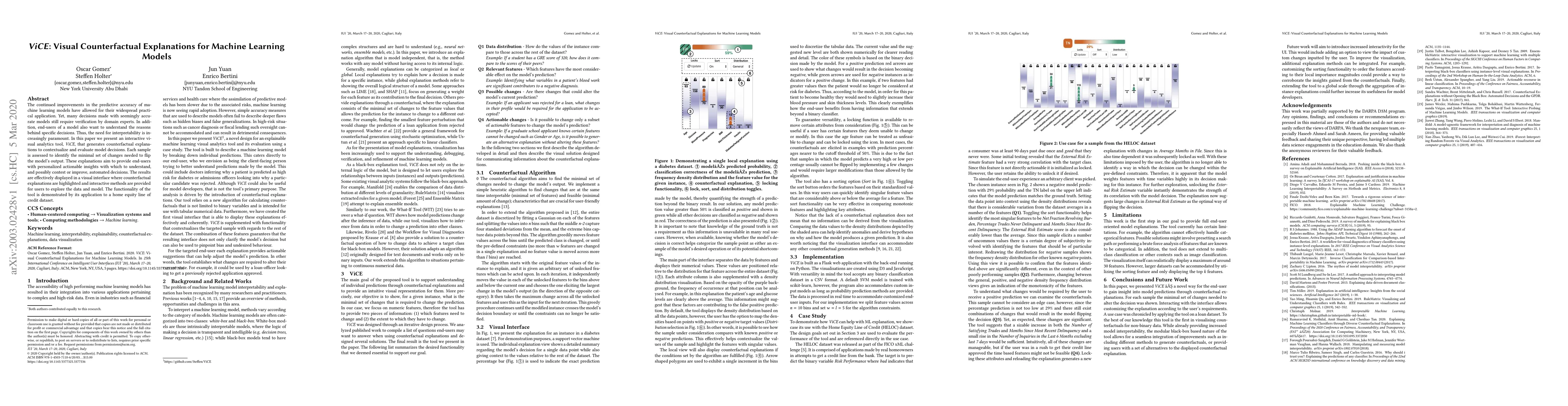 ViCE is an interactive visual analytics tool that generates visual counterfactual explanations to enhance the interpretability of machine learning models. It identifies minimal changes needed to alter model outputs, providing end-users with insights to understand and potentially contest or improve automated decisions.