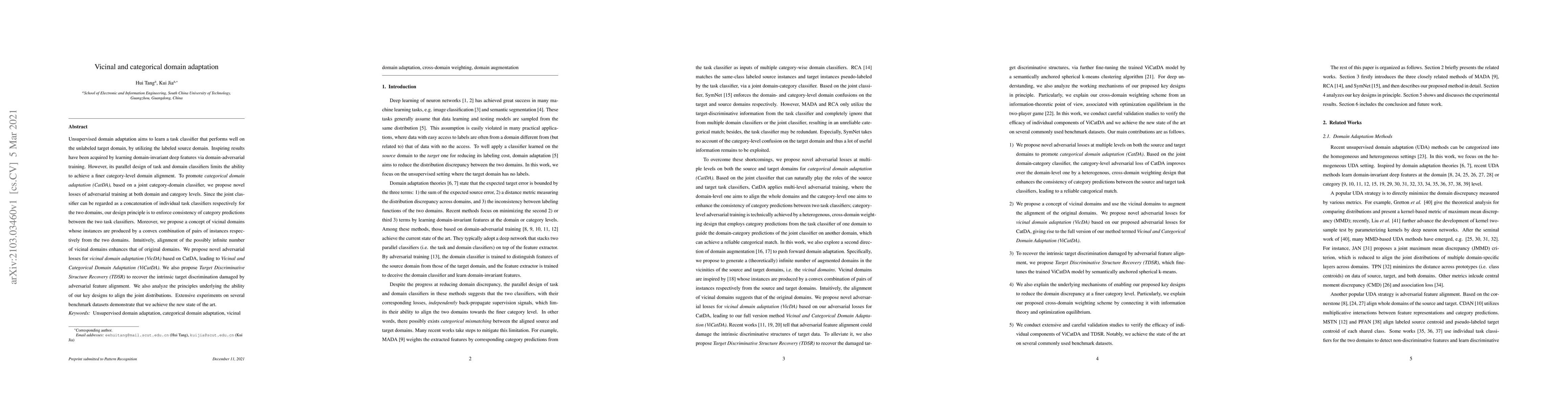 This paper proposes a novel framework for Vicinal and Categorical Domain Adaptation (ViCatDA) to improve domain adaptation by aligning both domain and category levels. It introduces adversarial training losses to enforce consistency between category predictions across domains and utilizes vicinal domains to enhance the alignment of original domains, achieving state-of-the-art results on benchmark datasets.