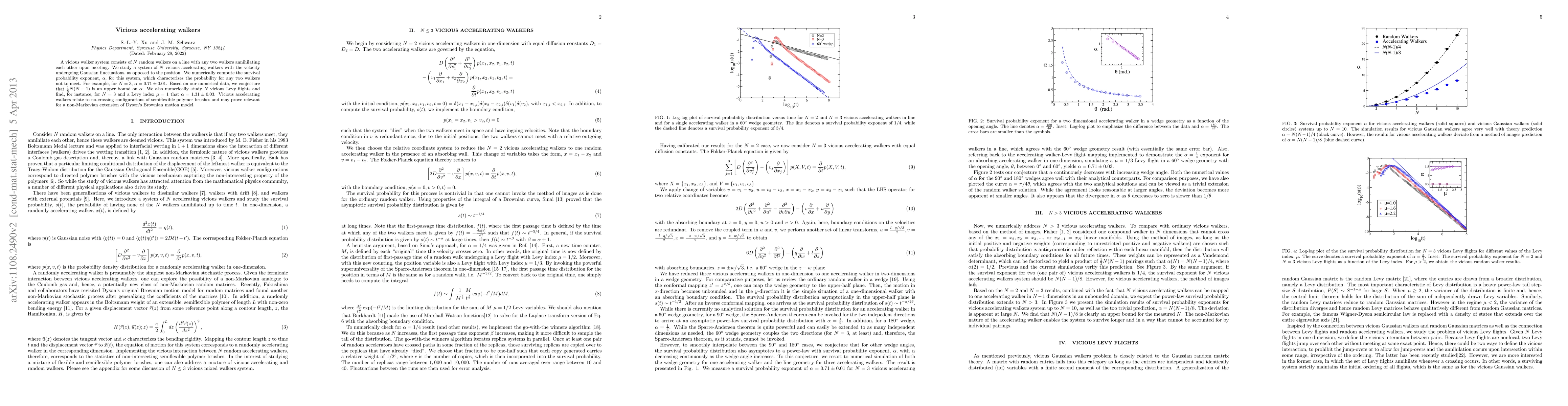 A vicious walker system consists of N random walkers on a line with any two walkers annihilating each other upon meeting. We study a system of N vicious accelerating walkers with the velocity undergoing Gaussian fluctuations, as opposed to the position. We numerically compute the survival probability exponent, {\alpha}, for this system, which characterizes the probability for any two walkers not to meet. For example, for N = 3, {\alpha} = 0.71 \pm 0.01. Based on our numerical data, we conjecture that 1/8N(N - 1) is an upper bound on {\alpha}. We also numerically study N vicious Levy flights and find, for instance, for N = 3 and a Levy index {\mu} = 1 that {\alpha} = 1.31 \pm 0.03. Vicious accelerating walkers relate to no-crossing configurations of semiflexible polymer brushes and may prove relevant for a non-Markovian extension of Dyson's Brownian motion model.