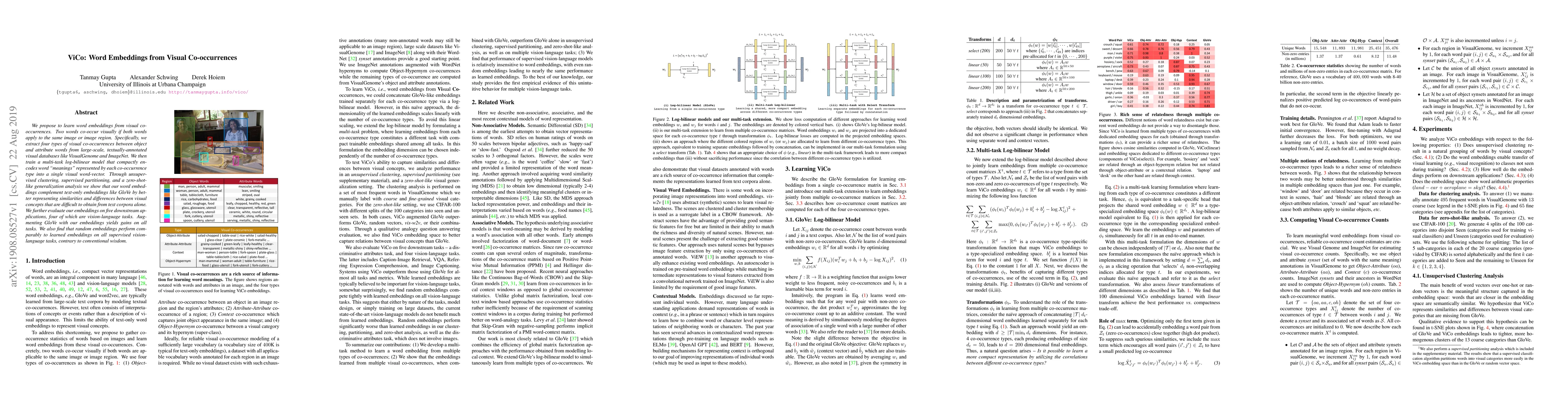 This paper proposes ViCo, a method for learning word embeddings from visual co-occurrences, showing that it complements text-only embeddings like GloVe by better representing visual concept similarities. The embeddings improve performance on vision-language tasks when combined with GloVe, contrary to the belief that random embeddings are ineffective for supervised tasks.