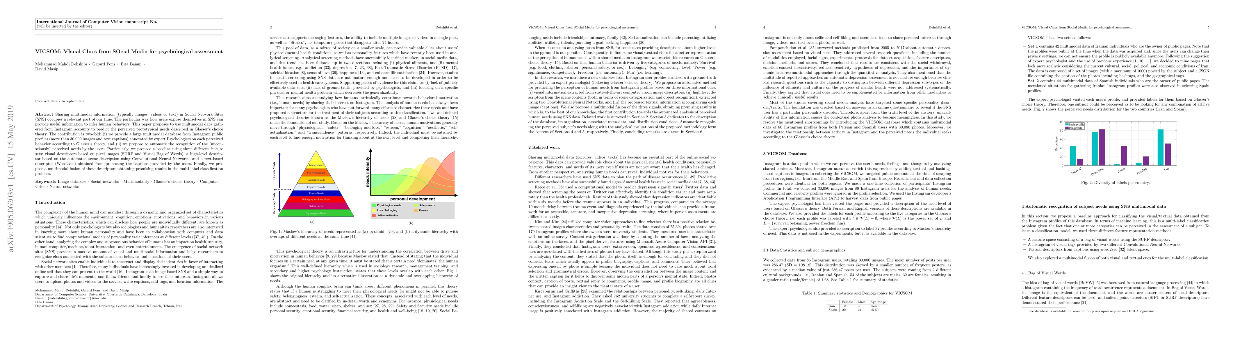 Sharing multimodal information (typically images, videos or text) in Social Network Sites (SNS) occupies a relevant part of our time. The particular way how users expose themselves in SNS can provide useful information to infer human behaviors. This paper proposes to use multimodal data gathered from Instagram accounts to predict the perceived prototypical needs described in Glasser's choice theory. The contribution is two-fold: (i) we provide a large multimodal database from Instagram public profiles (more than 30,000 images and text captions) annotated by expert Psychologists on each perceived behavior according to Glasser's theory, and (ii) we propose to automate the recognition of the (unconsciously) perceived needs by the users. Particularly, we propose a baseline using three different feature sets: visual descriptors based on pixel images (SURF and Visual Bag of Words), a high-level descriptor based on the automated scene description using Convolutional Neural Networks, and a text-based descriptor (Word2vec) obtained from processing the captions provided by the users. Finally, we propose a multimodal fusion of these descriptors obtaining promising results in the multi-label classification problem.