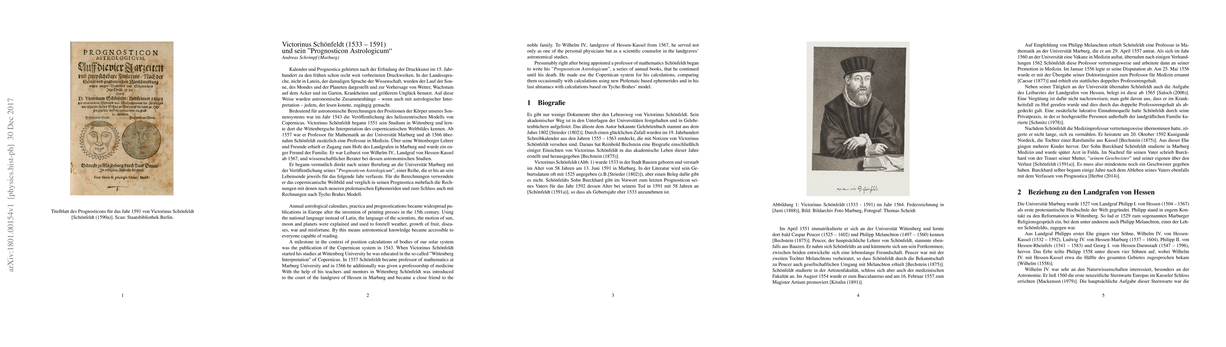 Annual astrological calendars, practica and prognostications became widespread publications in Europe after the invention of printing presses in the 15th century. Using the national language instead of Latin, the language of the scientists, the motion of sun, moon and planets were explained and used to foretell weather, growth of fruit, diseases, war and misfortune. By this means astronomical knowledge became accessible to everyone capable of reading. A milestone in the context of position calculations of bodies of our solar system was the publication of the Copernican system in 1543. When Victorinus Sch\"onfeldt started his studies at Wittenberg University he was educated in the so called "Wittenberg Interpretation" of Copernicus. In 1557 Sch\"onfeldt became professor of mathematics at Marburg University and in 1566 he additionally was given a professorship of medicine With the help of his teachers and mentors in Wittenberg Sch\"onfeldt was introduced to the court of the landgrave of Hessen in Marburg and became a close friend to the noble family. To Wilhelm IV., landgrave of Hessen-Kassel from 1567, he served not only as one of the personal physicians but as a scientific counselor in the landgraves' astronomical studies. Presumably right after being appointed a professor of mathematics Sch\"onfeldt began to write his "\emph{Prognosticon Astrologicum}", a series of annual books, that he continued until his death. He made use the Copernican system for his calculations, comparing them occasionally with calculations using new Ptolemaic based ephemerides and in his last almanacs with calculations based on Tycho Brahes' model.