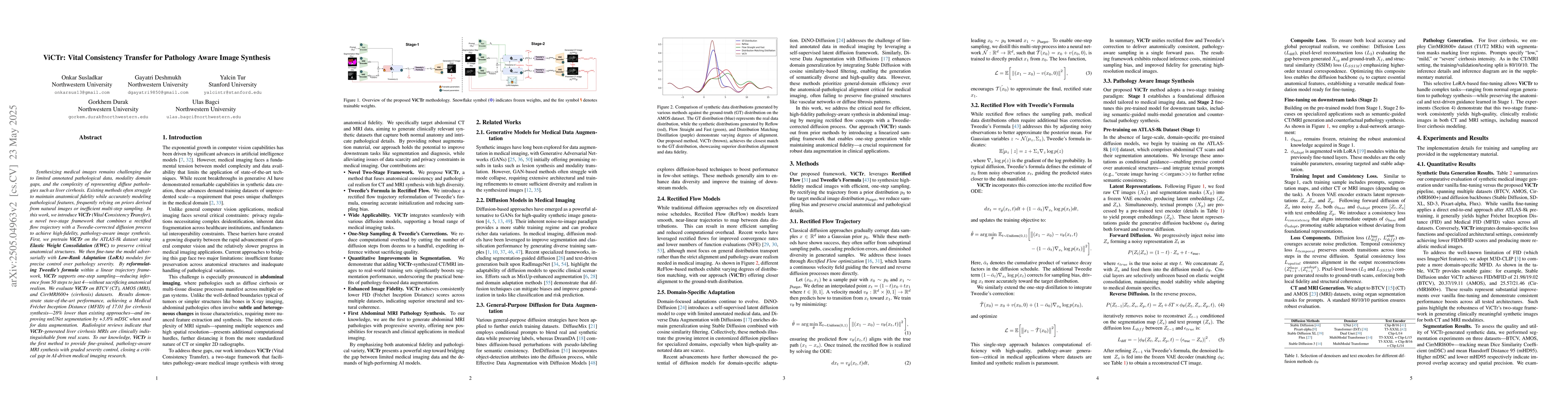 Synthesizing medical images remains challenging due to limited annotated pathological data, modality domain gaps, and the complexity of representing diffuse pathologies such as liver cirrhosis. Existing methods often struggle to maintain anatomical fidelity while accurately modeling pathological features, frequently relying on priors derived from natural images or inefficient multi-step sampling. In this work, we introduce ViCTr (Vital Consistency Transfer), a novel two-stage framework that combines a rectified flow trajectory with a Tweedie-corrected diffusion process to achieve high-fidelity, pathology-aware image synthesis. First, we pretrain ViCTr on the ATLAS-8k dataset using Elastic Weight Consolidation (EWC) to preserve critical anatomical structures. We then fine-tune the model adversarially with Low-Rank Adaptation (LoRA) modules for precise control over pathology severity. By reformulating Tweedie's formula within a linear trajectory framework, ViCTr supports one-step sampling, reducing inference from 50 steps to just 4, without sacrificing anatomical realism. We evaluate ViCTr on BTCV (CT), AMOS (MRI), and CirrMRI600+ (cirrhosis) datasets. Results demonstrate state-of-the-art performance, achieving a Medical Frechet Inception Distance (MFID) of 17.01 for cirrhosis synthesis 28% lower than existing approaches and improving nnUNet segmentation by +3.8% mDSC when used for data augmentation. Radiologist reviews indicate that ViCTr-generated liver cirrhosis MRIs are clinically indistinguishable from real scans. To our knowledge, ViCTr is the first method to provide fine-grained, pathology-aware MRI synthesis with graded severity control, closing a critical gap in AI-driven medical imaging research.