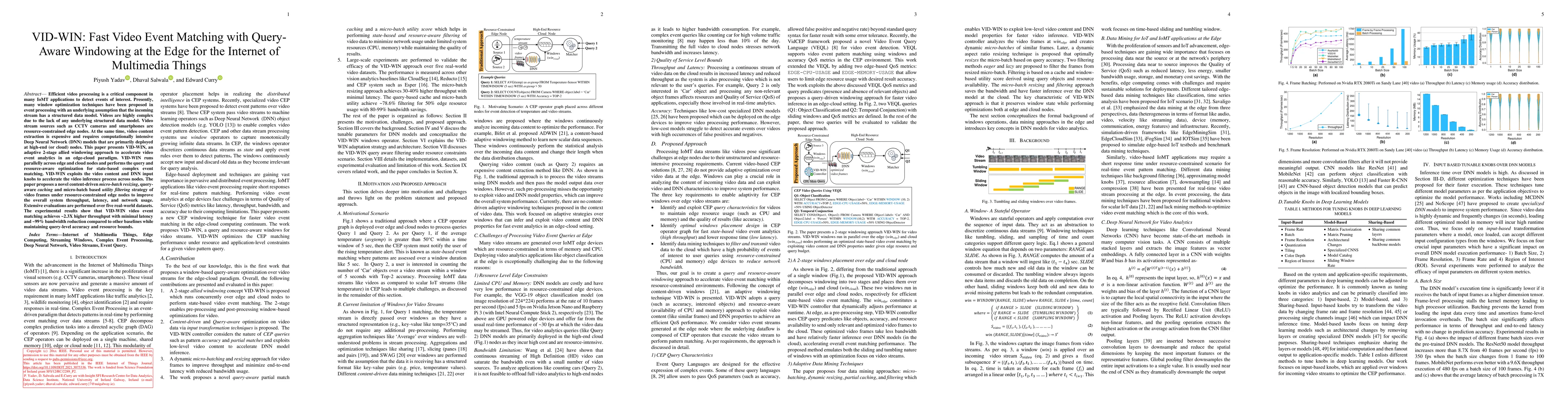 VID-WIN introduces an adaptive two-stage windowing approach for fast video event matching in edge-cloud environments, optimizing resource usage and improving throughput. The method achieves significant performance gains with minimal latency and bandwidth reduction, outperforming existing techniques.