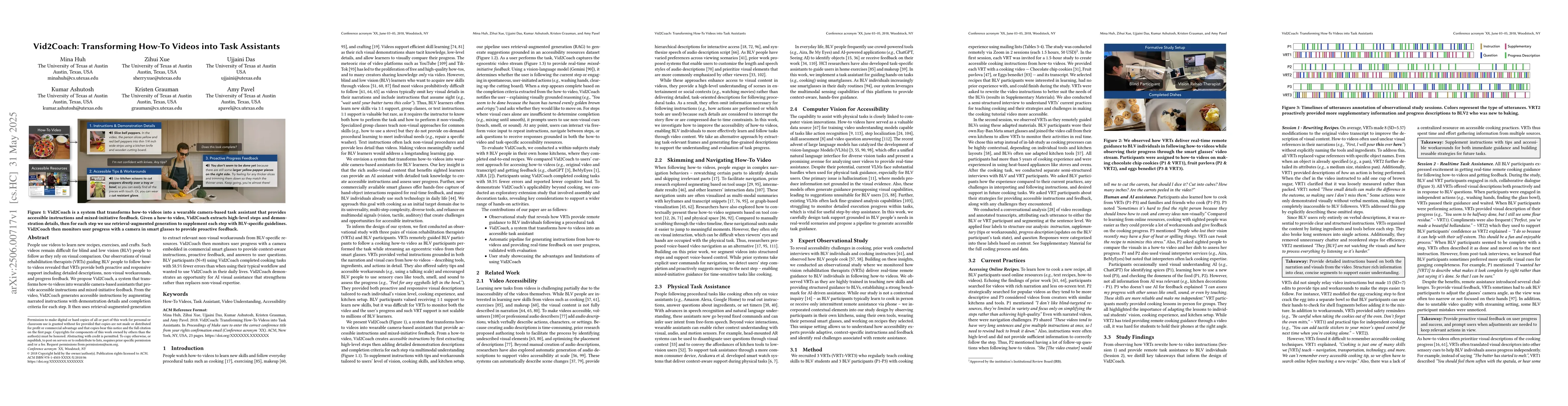 The paper describes observations of visual rehabilitation therapists (VRTs) guiding blind and low vision (BLV) individuals in following how-to videos, leading to the proposal of Vid2Coach, a system that transforms such videos into accessible task assistants.