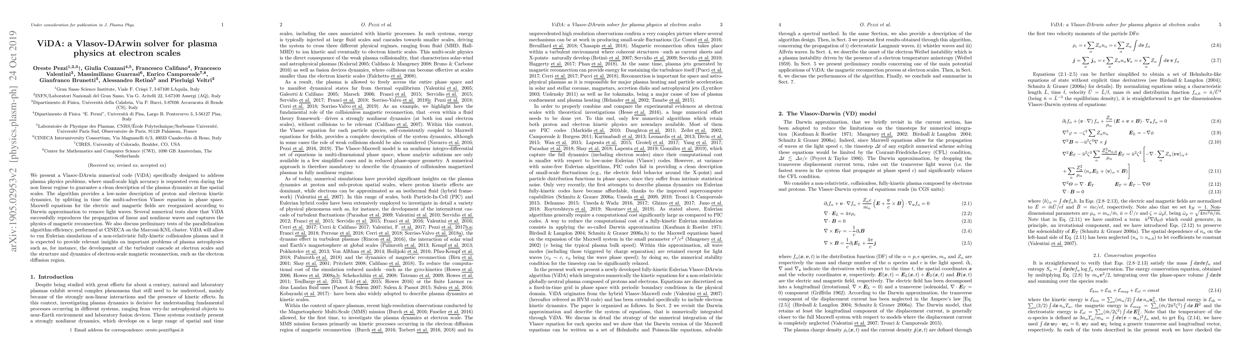 We present a Vlasov-DArwin numerical code (ViDA) specifically designed to address plasma physics problems, where small-scale high accuracy is requested even during the non linear regime to guarantee a clean description of the plasma dynamics at fine spatial scales. The algorithm provides a low-noise description of proton and electron kinetic dynamics, by splitting in time the multi-advection Vlasov equation in phase space. Maxwell equations for the electric and magnetic fields are reorganized according to Darwin approximation to remove light waves. Several numerical tests show that ViDA successfully reproduces the propagation of linear and nonlinear waves and captures the physics of magnetic reconnection. We also discuss preliminary tests of the parallelization algorithm efficiency, performed at CINECA on the Marconi-KNL cluster. ViDA will allow to run Eulerian simulations of a non-relativistic fully-kinetic collisionless plasma and it is expected to provide relevant insights on important problems of plasma astrophysics such as, for instance, the development of the turbulent cascade at electron scales and the structure and dynamics of electron-scale magnetic reconnection, such as the electron diffusion region.
