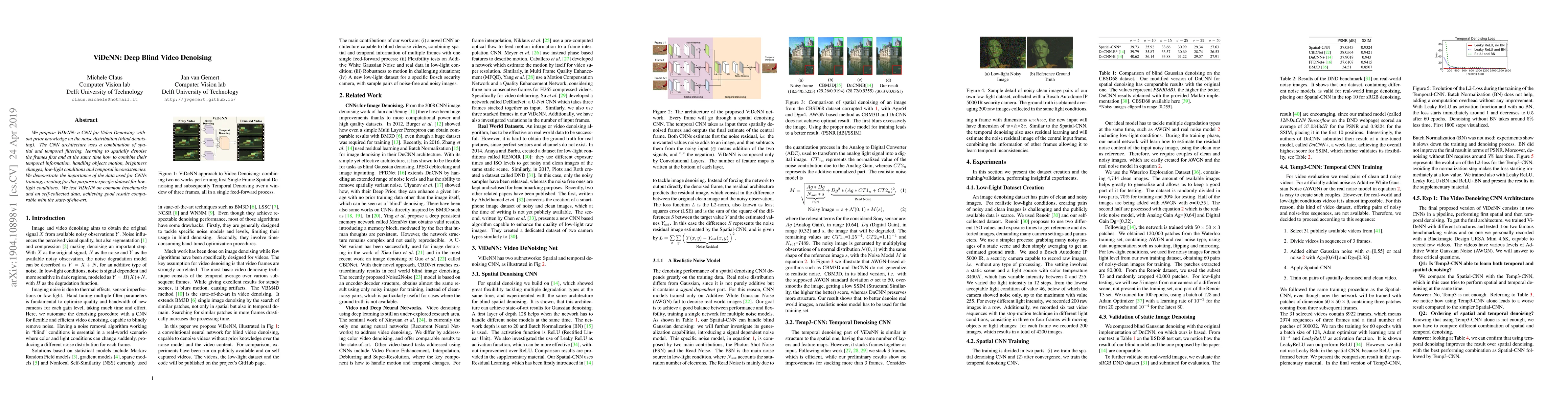 ViDeNN is a CNN-based approach for blind video denoising that combines spatial and temporal filtering to handle various video imperfections. The method was trained on a newly created low-light dataset and shows competitive results on standard benchmarks.