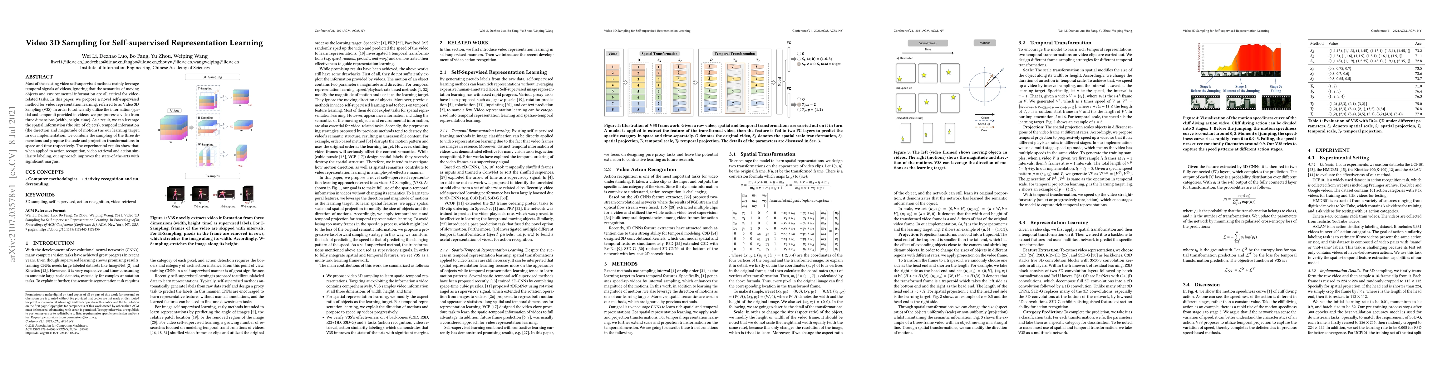 This paper introduces Video 3D Sampling (V3S), a self-supervised method for video representation learning that leverages both spatial and temporal information. The approach pre-processes videos in three dimensions to utilize object semantics and environmental context, achieving state-of-the-art results in action recognition, video retrieval, and action similarity labeling.