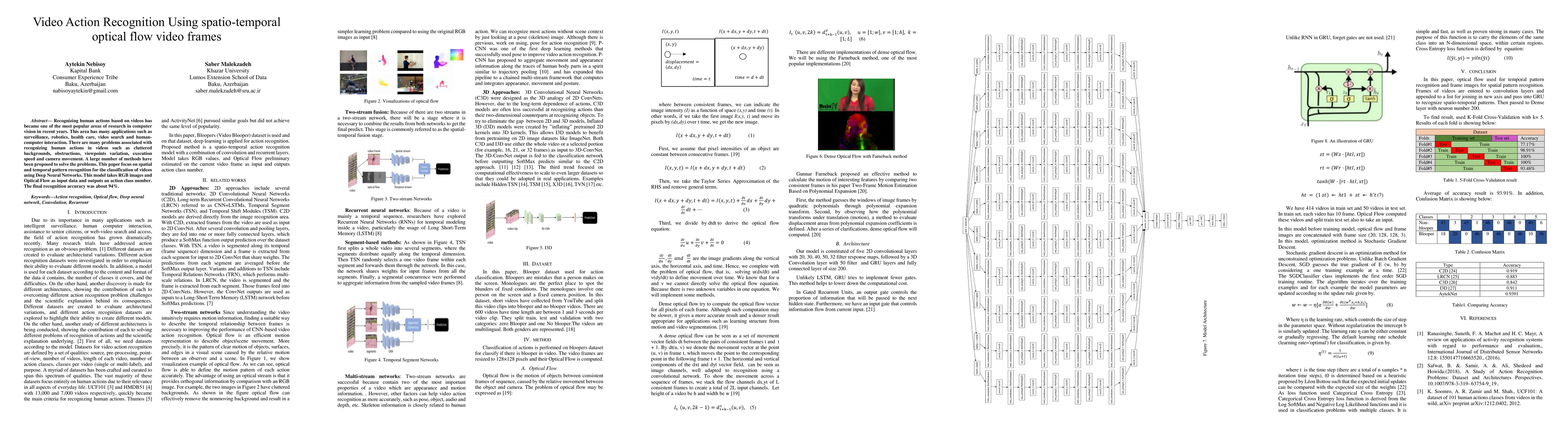 This paper proposes a deep neural network model for video action recognition using spatial and temporal patterns from RGB images and optical flow. It achieves an accuracy of approximately 94% in classifying human actions in video sequences.