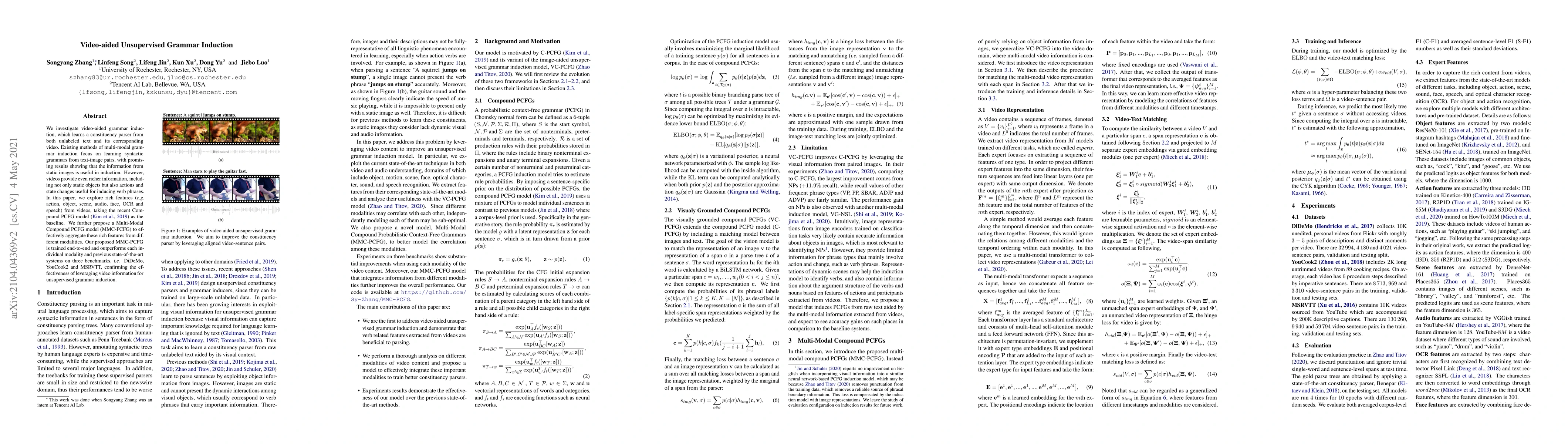 We investigate video-aided grammar induction, which learns a constituency parser from both unlabeled text and its corresponding video. Existing methods of multi-modal grammar induction focus on learning syntactic grammars from text-image pairs, with promising results showing that the information from static images is useful in induction. However, videos provide even richer information, including not only static objects but also actions and state changes useful for inducing verb phrases. In this paper, we explore rich features (e.g. action, object, scene, audio, face, OCR and speech) from videos, taking the recent Compound PCFG model as the baseline. We further propose a Multi-Modal Compound PCFG model (MMC-PCFG) to effectively aggregate these rich features from different modalities. Our proposed MMC-PCFG is trained end-to-end and outperforms each individual modality and previous state-of-the-art systems on three benchmarks, i.e. DiDeMo, YouCook2 and MSRVTT, confirming the effectiveness of leveraging video information for unsupervised grammar induction.