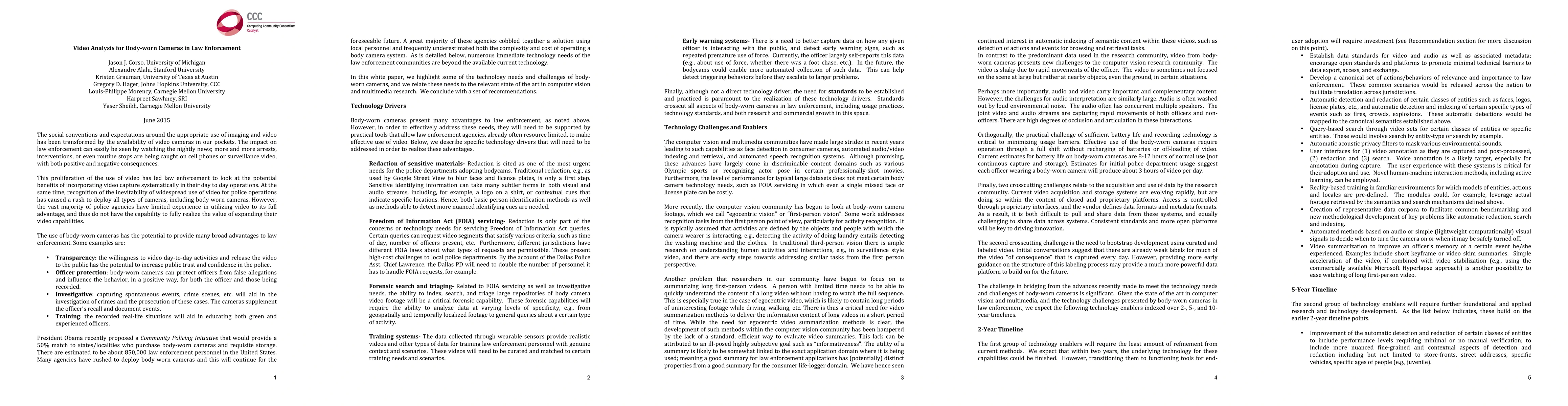 The social conventions and expectations around the appropriate use of imaging and video has been transformed by the availability of video cameras in our pockets. The impact on law enforcement can easily be seen by watching the nightly news; more and more arrests, interventions, or even routine stops are being caught on cell phones or surveillance video, with both positive and negative consequences. This proliferation of the use of video has led law enforcement to look at the potential benefits of incorporating video capture systematically in their day to day operations. At the same time, recognition of the inevitability of widespread use of video for police operations has caused a rush to deploy all types of cameras, including body worn cameras. However, the vast majority of police agencies have limited experience in utilizing video to its full advantage, and thus do not have the capability to fully realize the value of expanding their video capabilities. In this white paper, we highlight some of the technology needs and challenges of body-worn cameras, and we relate these needs to the relevant state of the art in computer vision and multimedia research. We conclude with a set of recommendations.