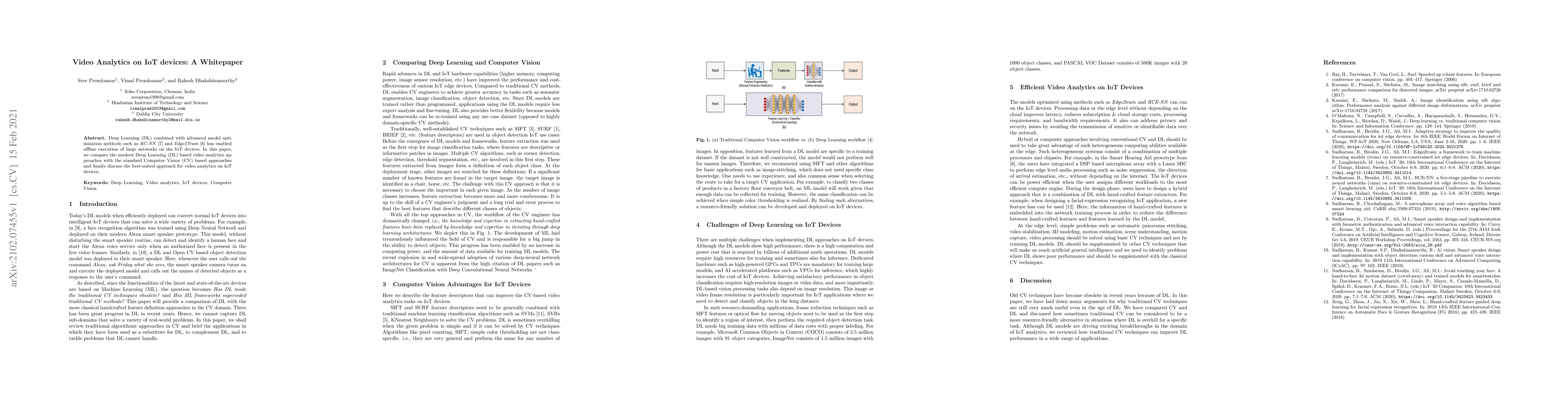 Deep Learning (DL) combined with advanced model optimization methods such as RC-NN and Edge2Train has enabled offline execution of large networks on the IoT devices. In this paper, we compare the modern Deep Learning (DL) based video analytics approaches with the standard Computer Vision (CV) based approaches and finally, discuss the best-suited approach for video analytics on IoT devices.