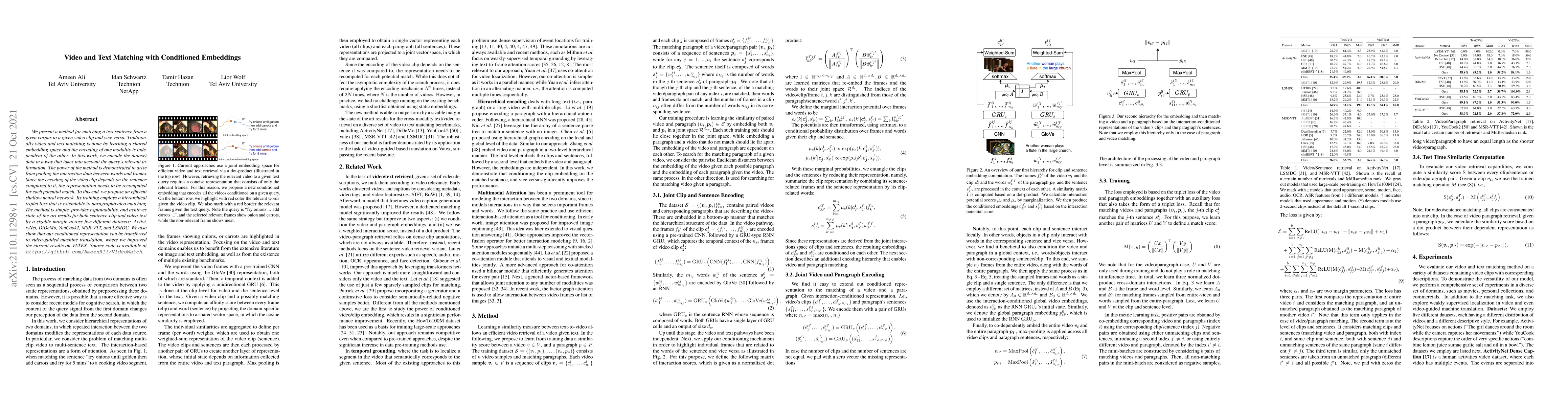 We present a method for matching a text sentence from a given corpus to a given video clip and vice versa. Traditionally video and text matching is done by learning a shared embedding space and the encoding of one modality is independent of the other. In this work, we encode the dataset data in a way that takes into account the query's relevant information. The power of the method is demonstrated to arise from pooling the interaction data between words and frames. Since the encoding of the video clip depends on the sentence compared to it, the representation needs to be recomputed for each potential match. To this end, we propose an efficient shallow neural network. Its training employs a hierarchical triplet loss that is extendable to paragraph/video matching. The method is simple, provides explainability, and achieves state-of-the-art results for both sentence-clip and video-text by a sizable margin across five different datasets: ActivityNet, DiDeMo, YouCook2, MSR-VTT, and LSMDC. We also show that our conditioned representation can be transferred to video-guided machine translation, where we improved the current results on VATEX. Source code is available at https://github.com/AmeenAli/VideoMatch.
