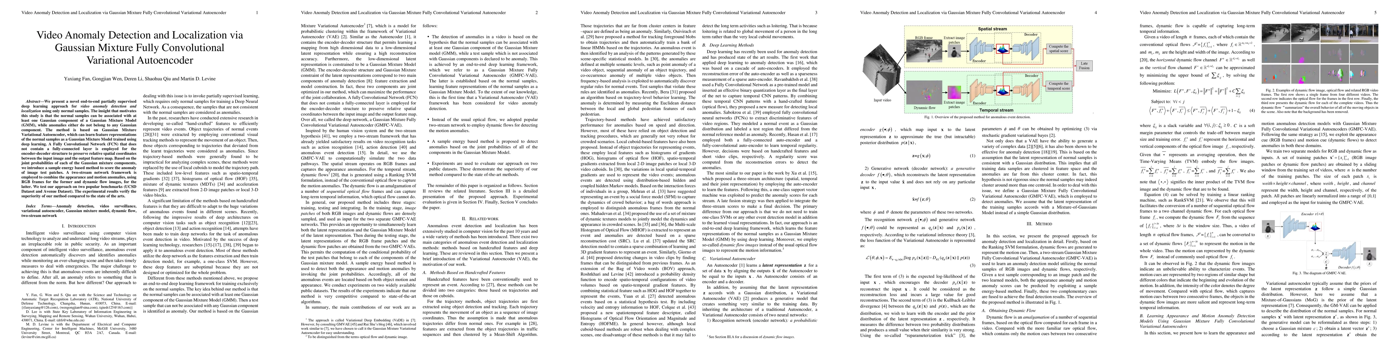This paper proposes a deep learning approach for video anomaly detection and localization using Gaussian Mixture Fully Convolutional Variational Autoencoders, which leverages normal samples to identify anomalies without requiring labeled abnormal data. The method combines a two-stream network for appearance and motion analysis and demonstrates superior performance on benchmark datasets.