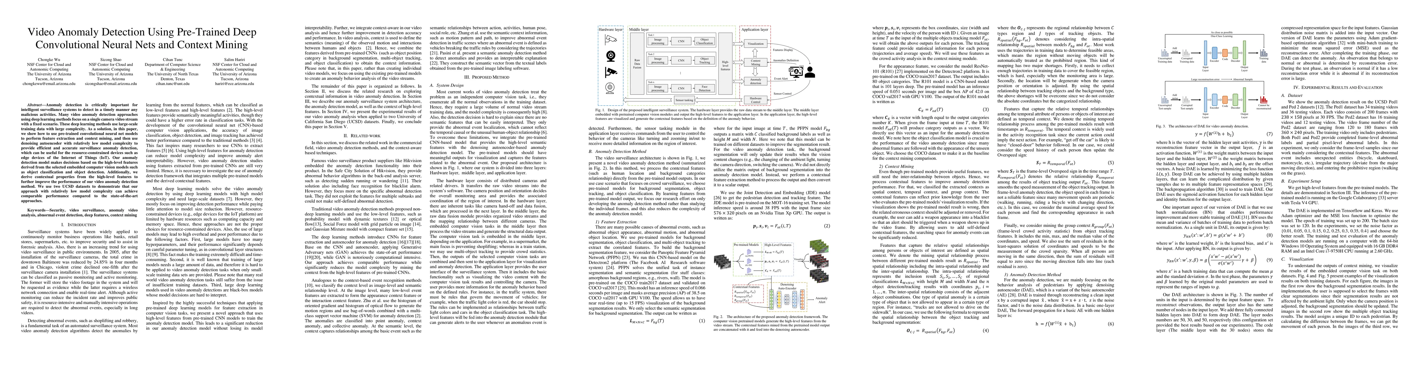 Anomaly detection is critically important for intelligent surveillance systems to detect in a timely manner any malicious activities. Many video anomaly detection approaches using deep learning methods focus on a single camera video stream with a fixed scenario. These deep learning methods use large-scale training data with large complexity. As a solution, in this paper, we show how to use pre-trained convolutional neural net models to perform feature extraction and context mining, and then use denoising autoencoder with relatively low model complexity to provide efficient and accurate surveillance anomaly detection, which can be useful for the resource-constrained devices such as edge devices of the Internet of Things (IoT). Our anomaly detection model makes decisions based on the high-level features derived from the selected embedded computer vision models such as object classification and object detection. Additionally, we derive contextual properties from the high-level features to further improve the performance of our video anomaly detection method. We use two UCSD datasets to demonstrate that our approach with relatively low model complexity can achieve comparable performance compared to the state-of-the-art approaches.